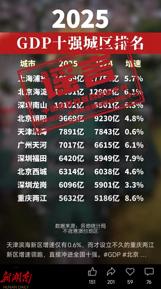 详情: 近日,有网民在网络平台发布视频称“2025年GDP十强城区排名中,滨海新区增速仅为0.6%”,引发关注。经当地有关部门核查,该数据不实。天津滨海新区已公布2025年地区生产总值增长为5%。