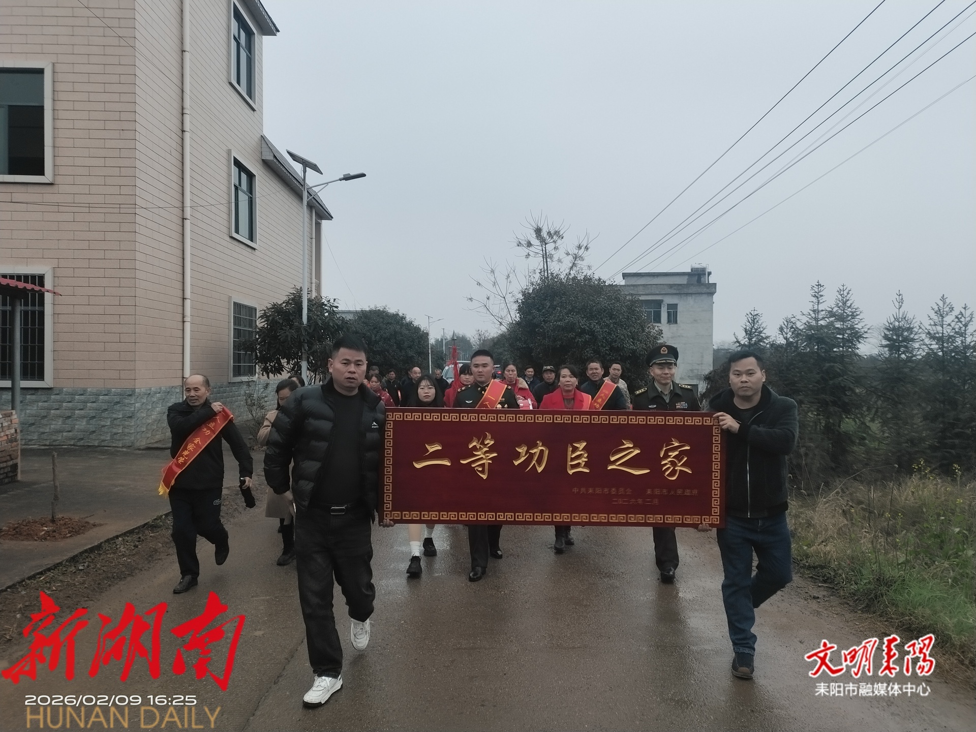 耒阳融媒2月10日讯(记者 江维东) 锣鼓喧天传喜讯,锦旗映彩耀门庭。2月9日,暖意融融,耒阳市委常委、市人武部政委廖伟林,副市长伍检告带队到南京镇白毛村,为荣立二等功的现役军人贺胜广送上喜报、牌匾和关怀,让功臣家庭共享荣光,让尊崇军人的暖流浸润乡村。