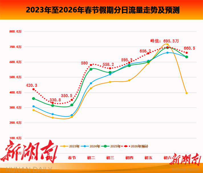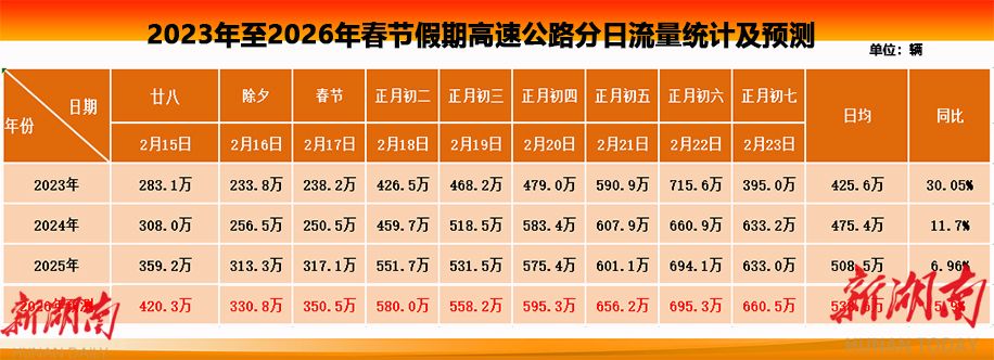湖南省高速公路路网运行监测指挥中心研判,春节假期,全省高速公路路网车流总量将再创历史新高,出入口通行车辆总数预计为4,847.3万辆同比增长约5.9%,约为平日的2.2倍。