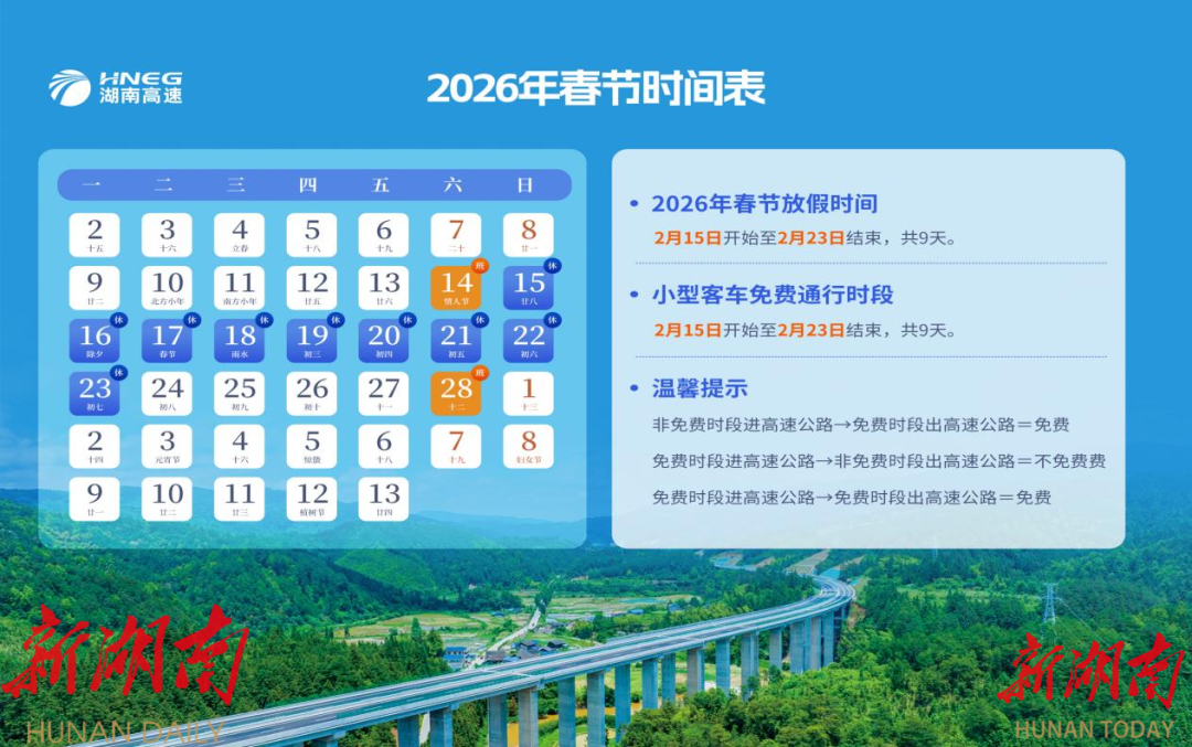 湖南日报2月11日讯(全媒体记者孟姣燕见习记者陈娟)“史上最长春节”假期即将来临,高速公路对7座及以下小型客车实施免费通行政策,免费时段为2月15日0时至2月23日24时(腊月廿八至正月初七),共计9天。