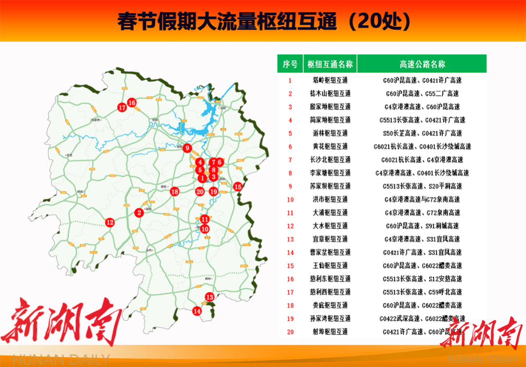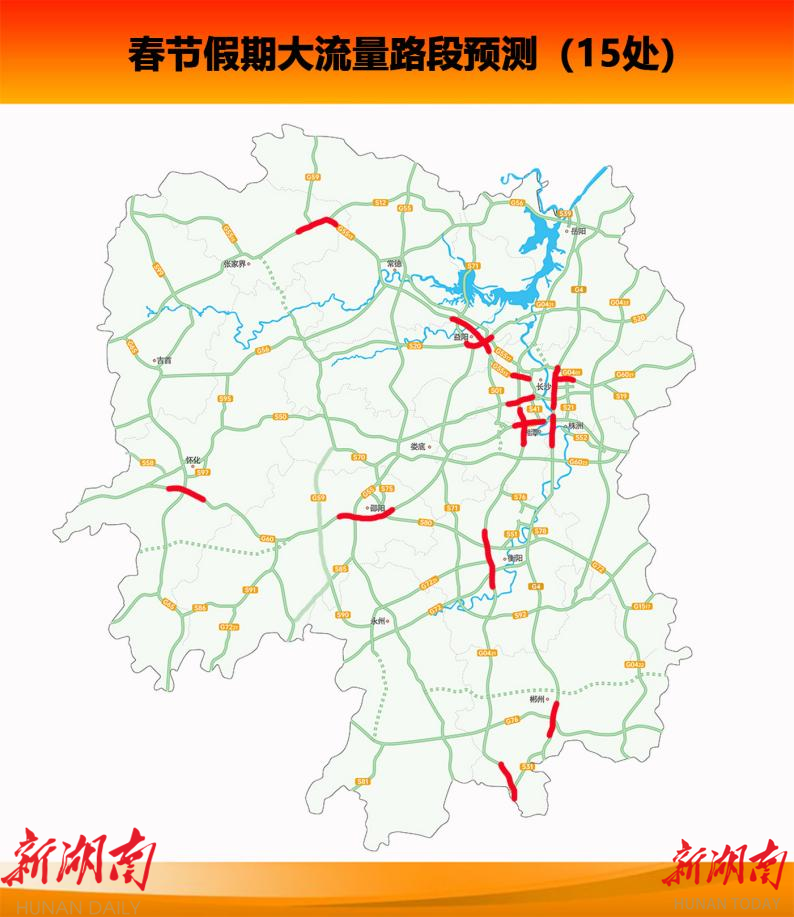 假期省内大流量路段预测有15处,主要集中在G5513长张高速长沙段、益阳段、张家界段;G4京港澳高速长沙段、湘潭段、郴州段;G60沪昆高速湘潭段、邵阳段、怀化段;G0421许广高速湘潭段、衡阳段、郴州段;G6021杭长高速长沙段;S20平洞高速益阳段;S50长芷高速长沙段。