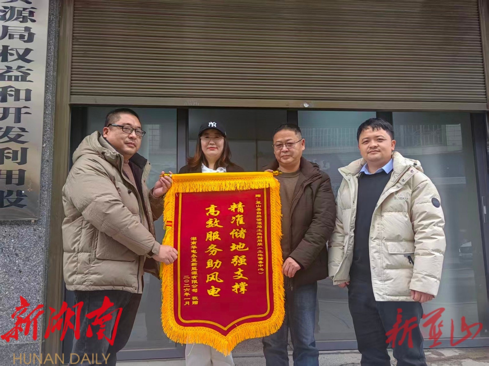 新蓝山客户端2月11日讯 (通讯员 罗群 雷向阳)近日,湖南华电永蓝新能源有限公司大源风电场项目负责人将写有“精准储地强支撑,高效服务助风电”的锦旗送到蓝山县自然资源局,以表达对该局高效保障大源风电场项目用地的感激之情。