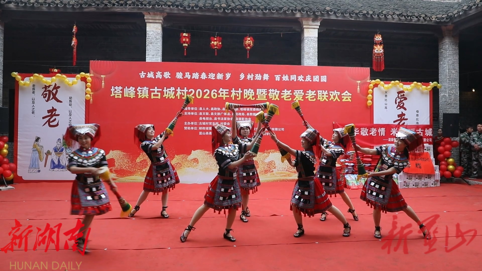 新蓝山客户端2月11日讯 (通讯员 赵彬 易紫轩)红灯笼映古宅,欢歌声润心田。2月10日,在蓝山县塔峰镇古城村,一场充满乡土气息和非物质文化遗产特色的“村晚”热闹上演,村民们自编自导自演,用歌舞、器乐和非物质文化遗产表演,为村里200多名70岁的老人送上新春祝福,也让传统年味在乡村大地焕发光彩。