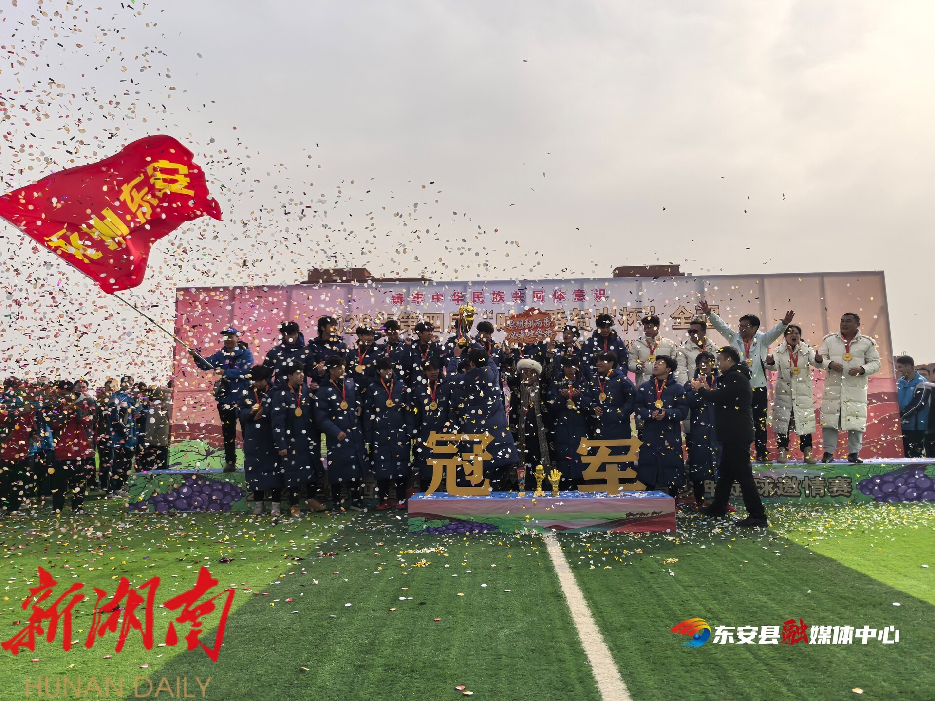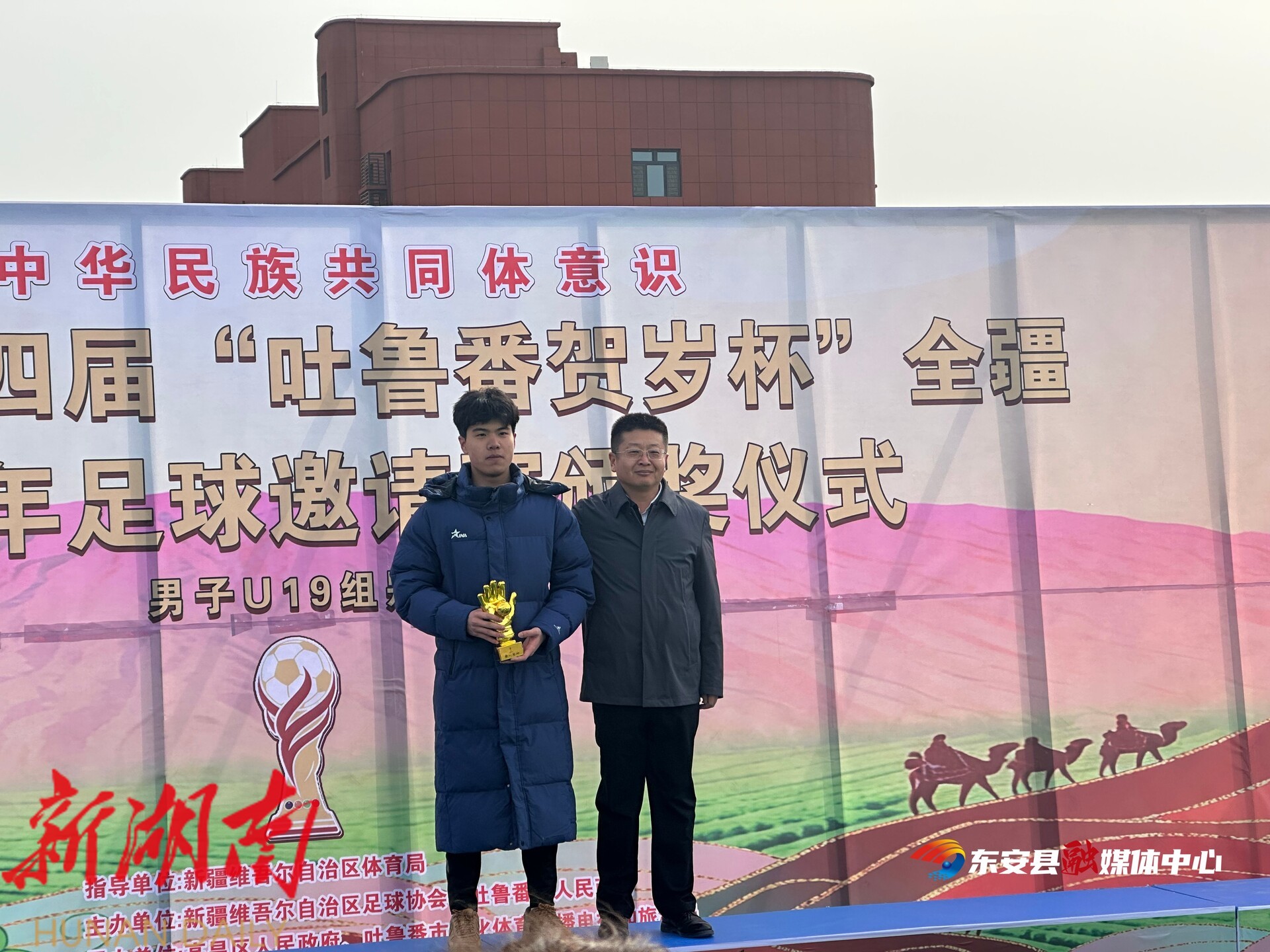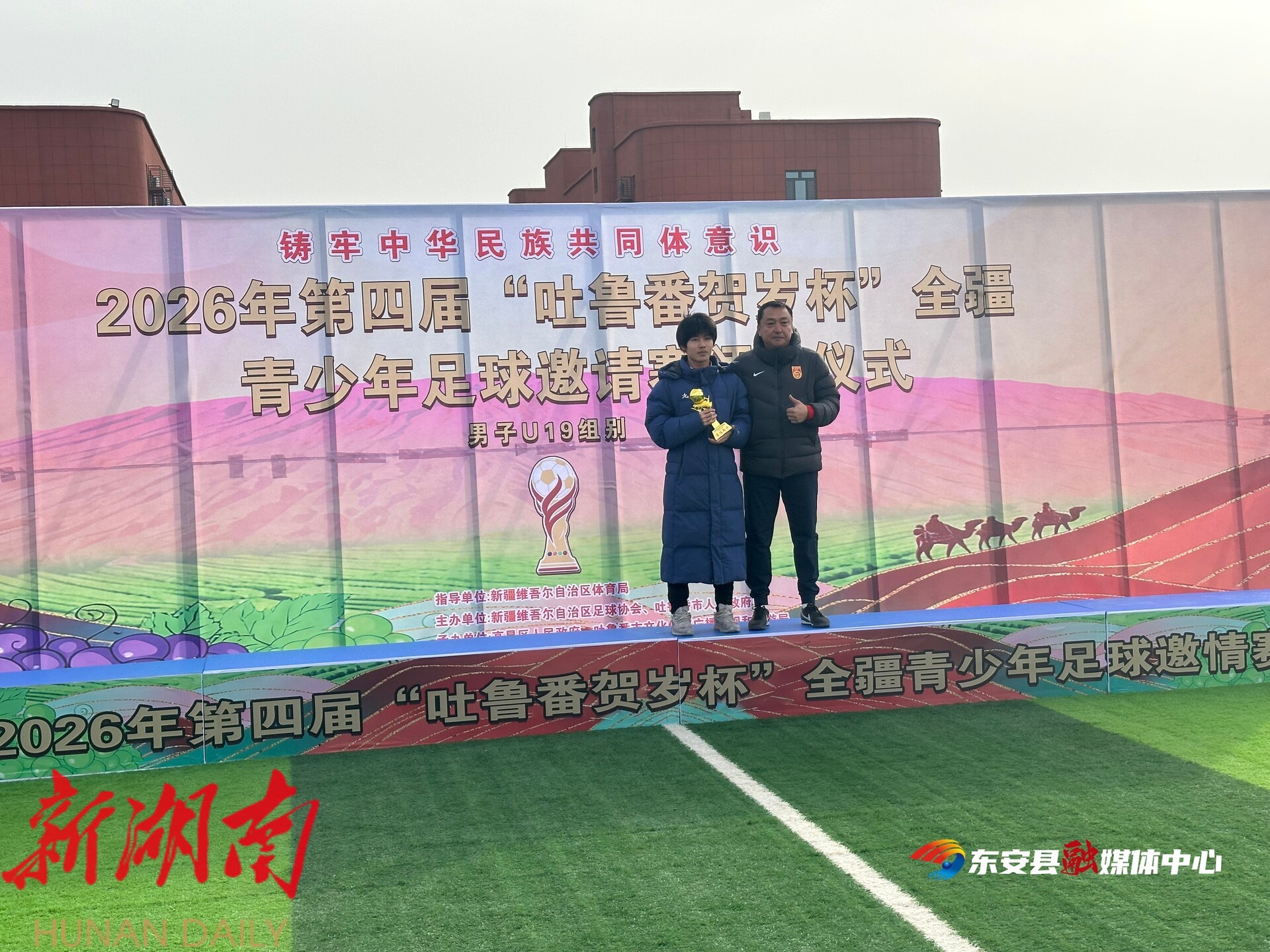 新湖南客户端2月11日讯(通讯员 严洁)2月11日12时45分,吐鲁番市实验中学。终场哨响,比分定格在3:0。湖南永州东安县代表队的少年们紧紧相拥,蓝色队服在阳光下跳动。他们以六战全胜、进20球失1球的完美战绩,夺得第四届“火洲贺岁杯”新疆青少年足球邀请赛冠军。