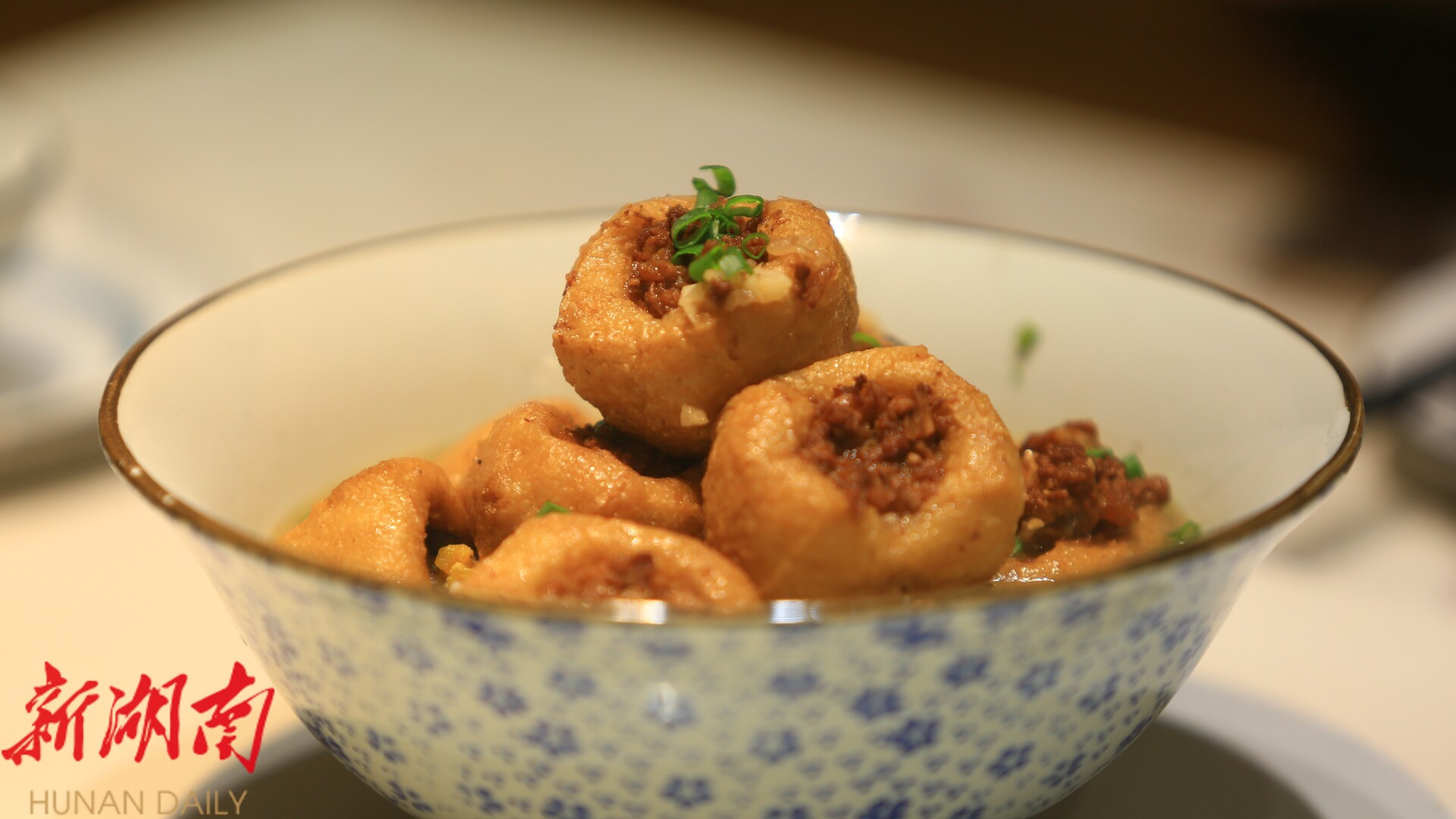 走进城区老牌餐厅,厨师正忙着准备制作酿豆腐的材料。金黄透亮、方方正正的油豆腐码上案头,肥瘦相间的五花肉经改刀切剁,再加入盐、鸡精、酱油等调料制成肉馅,即可上手制作酿豆腐。不一会儿,塞满肉馅的油豆腐瞬间化身饱满丰腴的胖胖“荷包”,更加惹人喜爱。