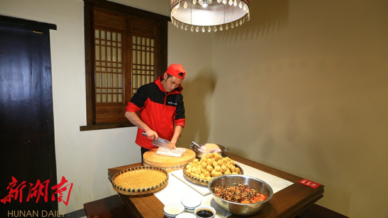 厨师谭朝铭说:“我们桂阳酿豆腐一般是以瘦肉和五花肉为主,今年我们店里搞个创新以糯米、红豆、咸蛋等五种材料搞了个糯米酿豆腐,象征着五谷丰登、五福临门。”