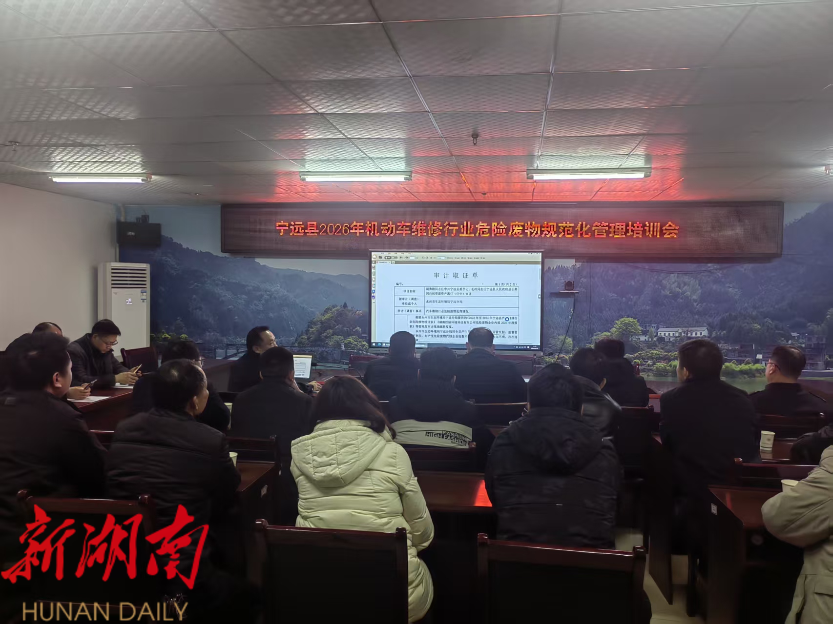 湖南日报·新湖南客户端2月12日讯(通讯员 王波 唐泽资 ) 2月10日,市生态环境局宁远分局组织召开2026年全县机动车维修行业危险废物管理培训会,进一步提升机动车维修行业危险废物规范化管理水平, 提高机动车维修企业生态环保意识,全县35家管理类别为一类和二类机动车维修企业的环保负责人参加培训。