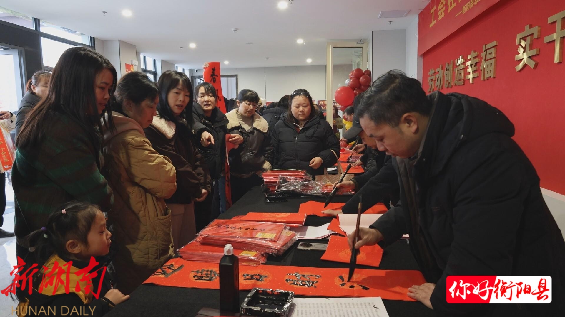 活动现场,特邀书法家们挥毫泼墨,根据职工个性化需求暖心定制春联,一幅幅寓意吉祥的春联、福字,深受广大职工欢迎。随后,大家一同观看喜剧电影《年会不能停》,在轻松欢快的氛围中舒缓压力,丰富职工节日生活。观影结束后,工作人员为职工们发放春节大礼包,让留衡过年更有温情。今年是重庆籍职工张学海在衡阳工作的第十年,因工厂订单繁忙,他主动选择错峰休假、留衡坚守岗位,全力助力企业完成年底生产任务。