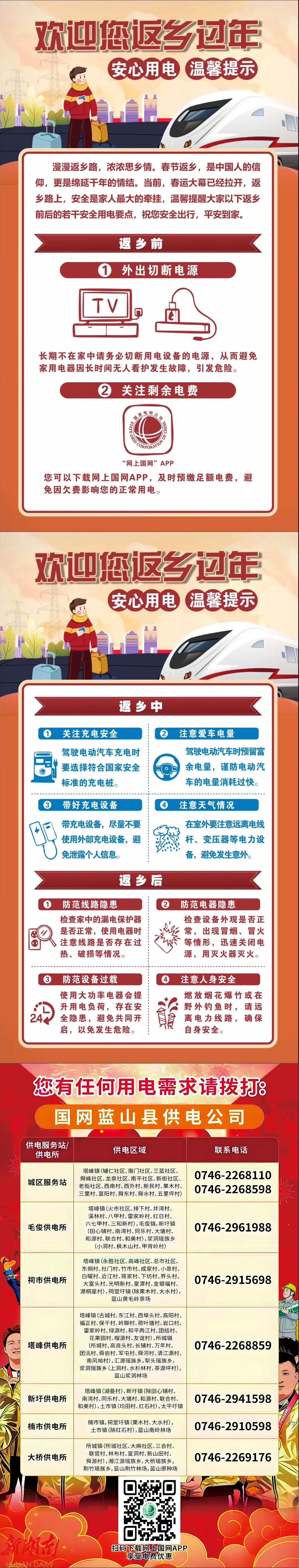 国网蓝山县供电公司欢迎您回家团圆!在这喜庆团圆的新春佳节,国网蓝山县供电公司全体员工向您及您的家人致以最诚挚的新年祝福!祝您在新的一年里阖家欢乐、幸福安康、事业顺遂、财源广进!过去的一年,我们始终坚守岗位,为您提供安全、稳定、可靠的电力供应,用实际行动诠释着责任与担当。这离不开您一直以来对我们工作的理解与支持,在此,我们向您表示衷心的感谢!为了更好地服务您,现将公司营业厅春节期间的营业时间告知如下: