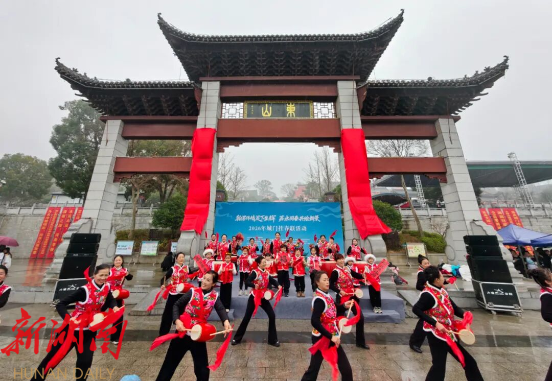 2月7日,“翰墨传情 足下生辉·苏永同春 共绘新景”跨省城门挂春联活动在东山景区举行。这是江苏该品牌活动首次走出省外,意义非凡。活动在《龙狮纳福》的欢腾鼓点中拉开帷幕,两地领导共同为跨省春联揭幕——“十三太保,苏韵激扬,卷展鸿猷超给力;第一橙心,柳篇新焕,春催马步永冲锋”。这副对联融苏永两地特色与冠军风采于一体,由两地书法家分别题写,笔力遒劲,意蕴悠长。现场为四位代表颁发“零陵区文化交流宣传推广大使”证书。随后,零陵花鼓戏、《戏韵双城》等节目轮番登场,文化市集上农特产品与非遗文创琳琅满目,书法家送福、中医院义诊,市民游客在湘情苏韵的交织中,感受别样年味。