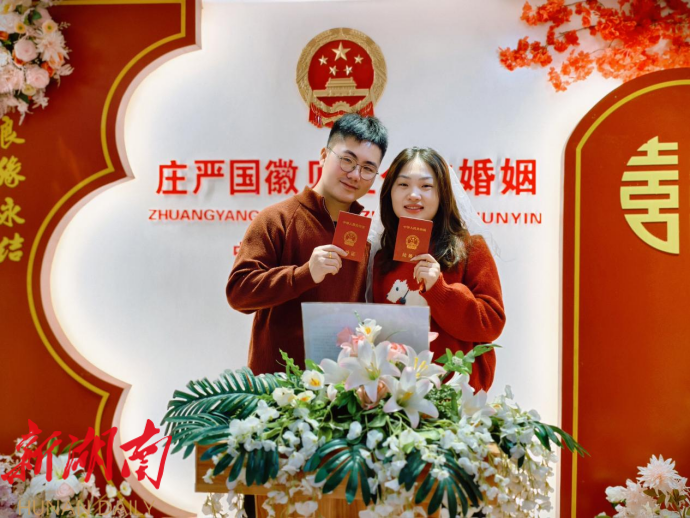 中方融媒2月14日 (通讯员:曾阳平)窗外,春光明媚,室内,喜气洋洋。 2月14日,恰逢腊月廿七,浪漫与年味同至。在中方县政务服务中心三楼大厅民政窗口,处处洋溢着幸福甜蜜的氛围。 “我们结婚 啦。 ”当天, 怀化市溆浦县的 谌 先生和 岳阳市平江县的 陈 女士 开心地在颁证大厅宣誓拍照打卡, 在 庄严国徽 见证下完成了人生的重要仪式,喜悦之情溢于言表 。