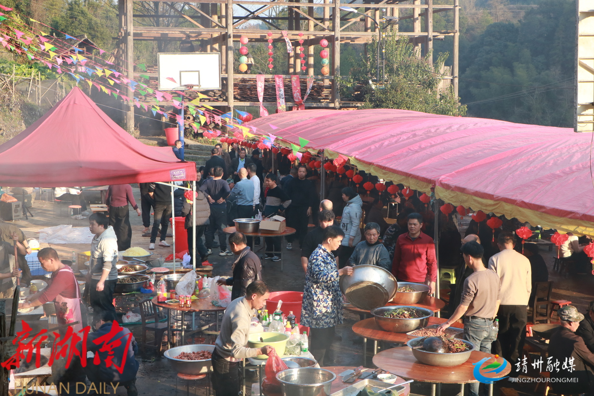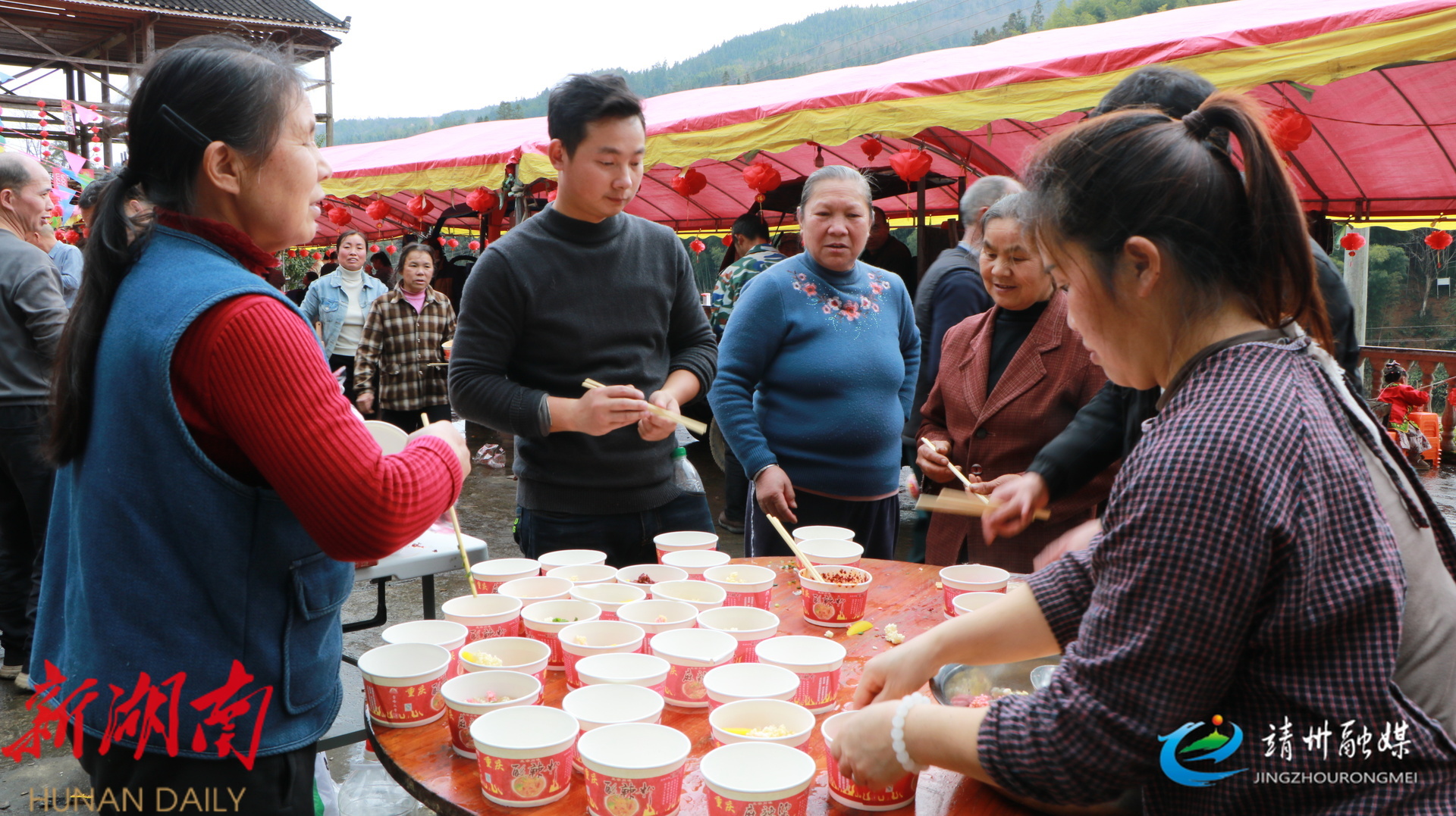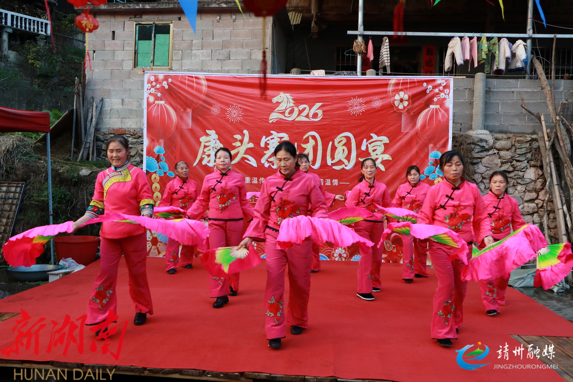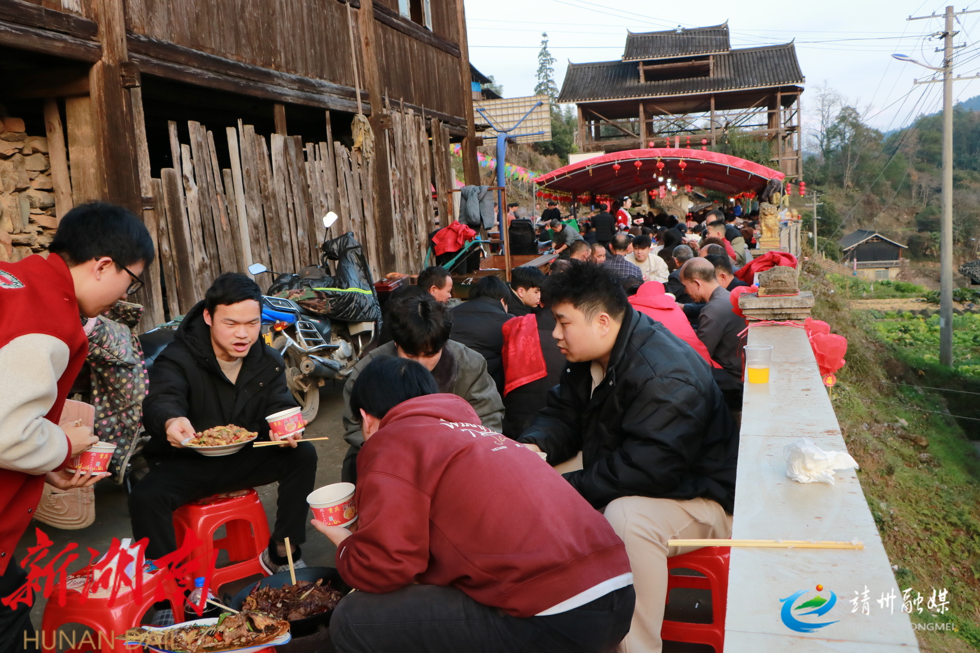 靖州融媒2月15日讯 (记者 夏源懋 刘昊)2月14日,靖州苗族侗族自治县藕团乡康头村康头寨处处洋溢着喜庆祥和的节日氛围,以“重温传统年味,共聚团圆温情”为主题的团圆宴正热闹开启。全村男女老少欢聚一堂,载歌载舞共迎新春。