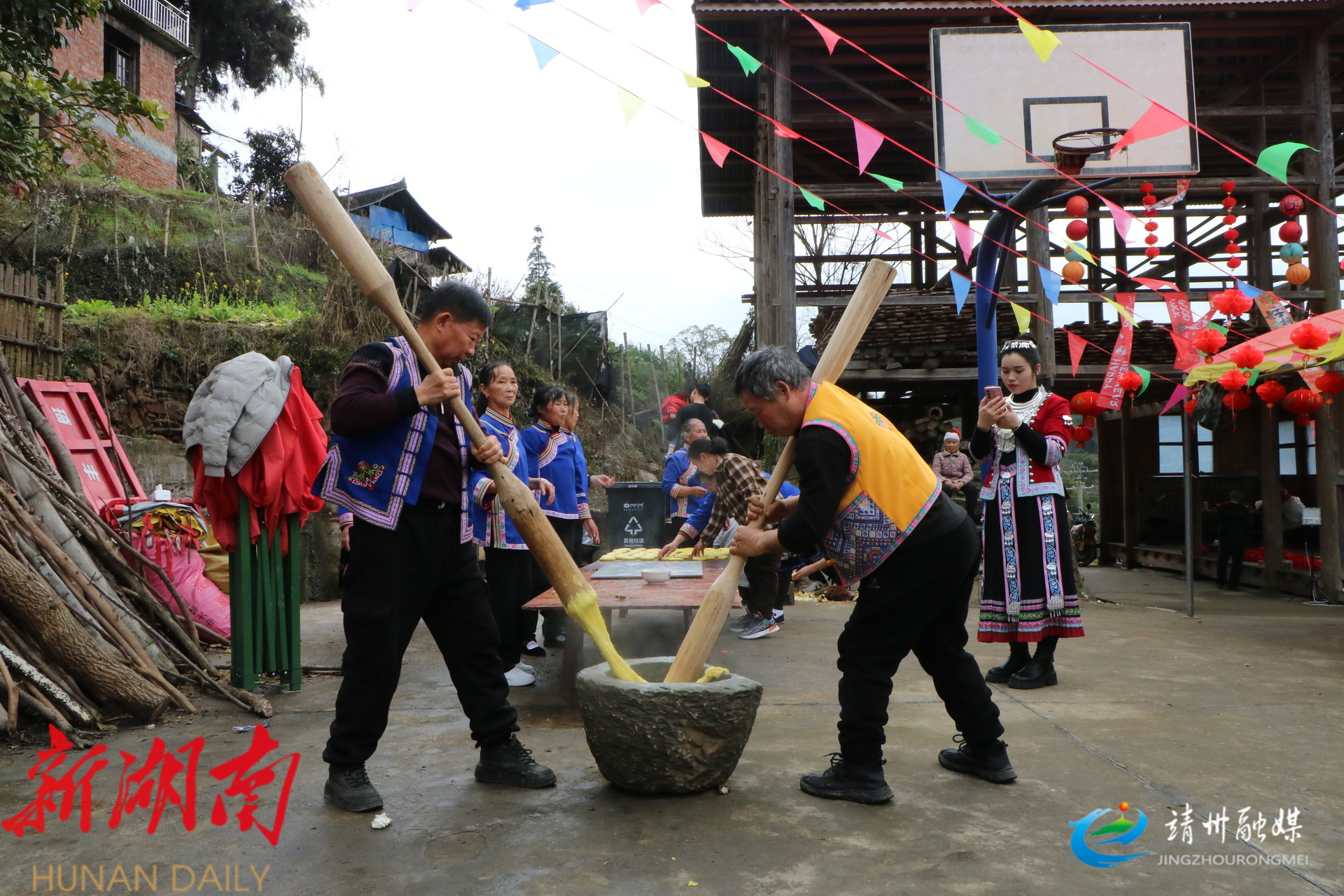 寨子里,红灯笼、中国结点缀其间,打糍粑、写春联、杀年猪等传统活动同步开展。村民分组参与,沉浸式感受地道传统年味。