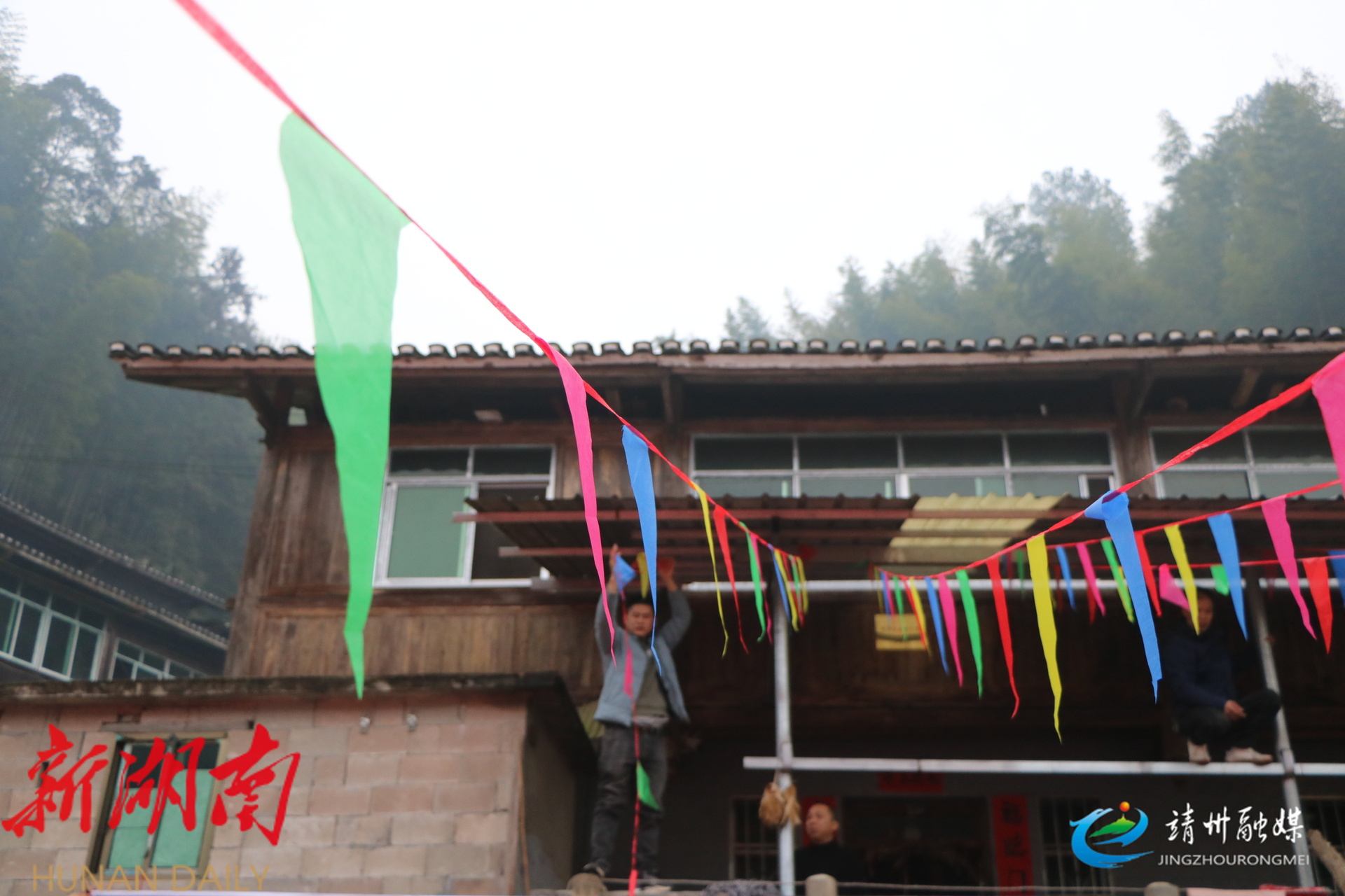 村民悬挂彩旗(夏源懋 摄)