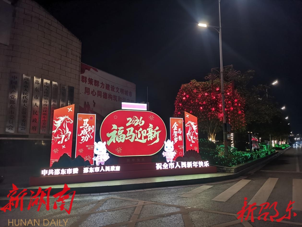 在邵东市政府,新春的氛围感同样拉满。恢弘的政府大门上,红灯笼整齐悬挂,“马到成功”“新春大吉”等祝福语醒目亮眼,与喜庆的装饰交相辉映,让政务区域在庄重之余,更添新春的热闹与祥和。城市主干道两旁,繁茂的枝头被五彩斑斓的彩灯精心点缀,灯光流转间,为过往市民营造出温馨浪漫的节日氛围。