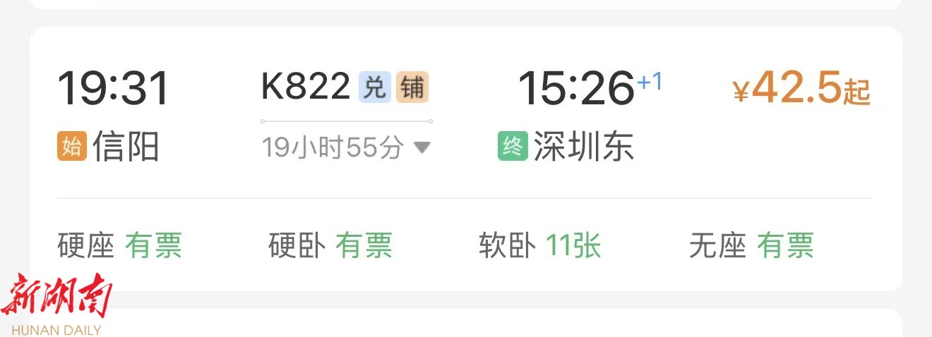 2月10日至16日K822次信阳至深圳东硬座打2折、全程42.5元
