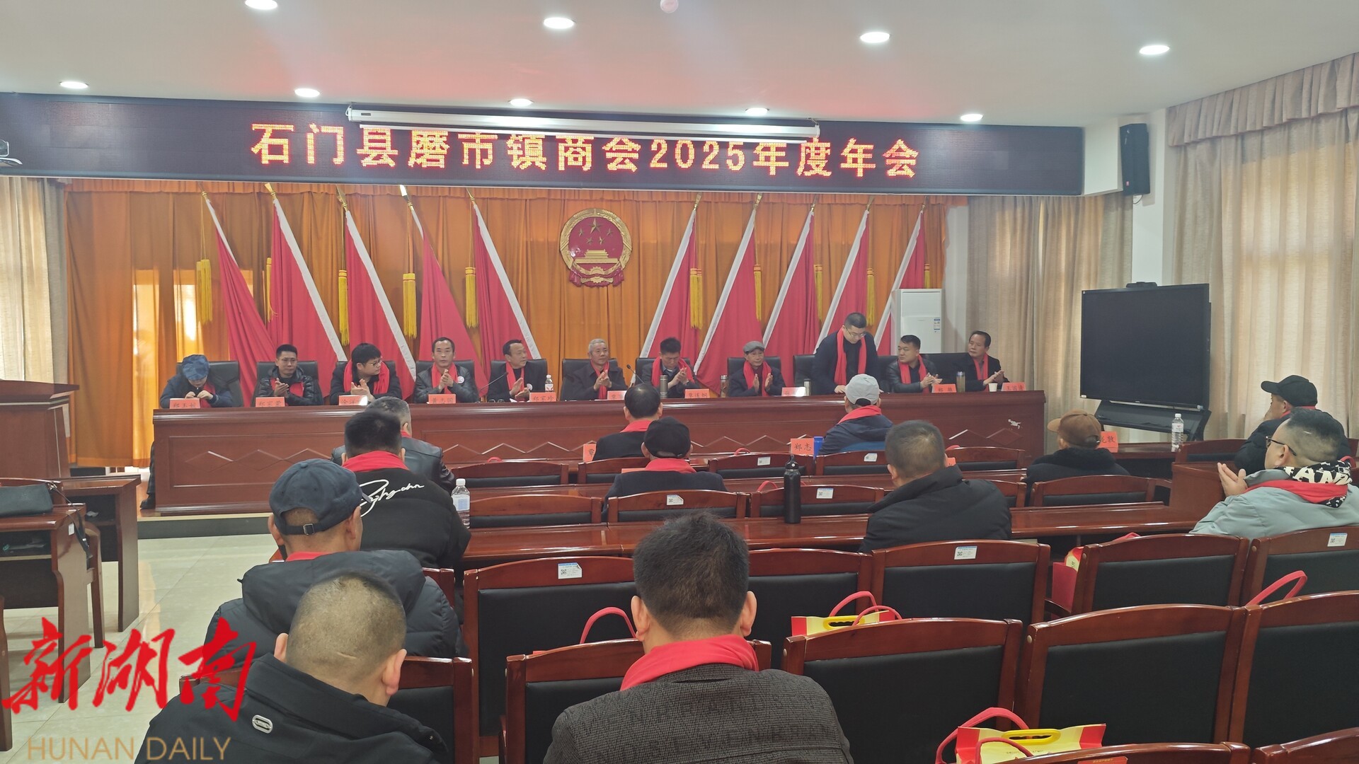 年会由中共石门县磨市镇商会党支部书记郑家珍主持。他微笑着挥手致意:“今天是腊月二十六,新春的脚步越来越近了。首先,我代表磨市镇商会,给大家拜个早年!祝大家在即将到来的马年里,一马当先、财源广进、阖家幸福!”