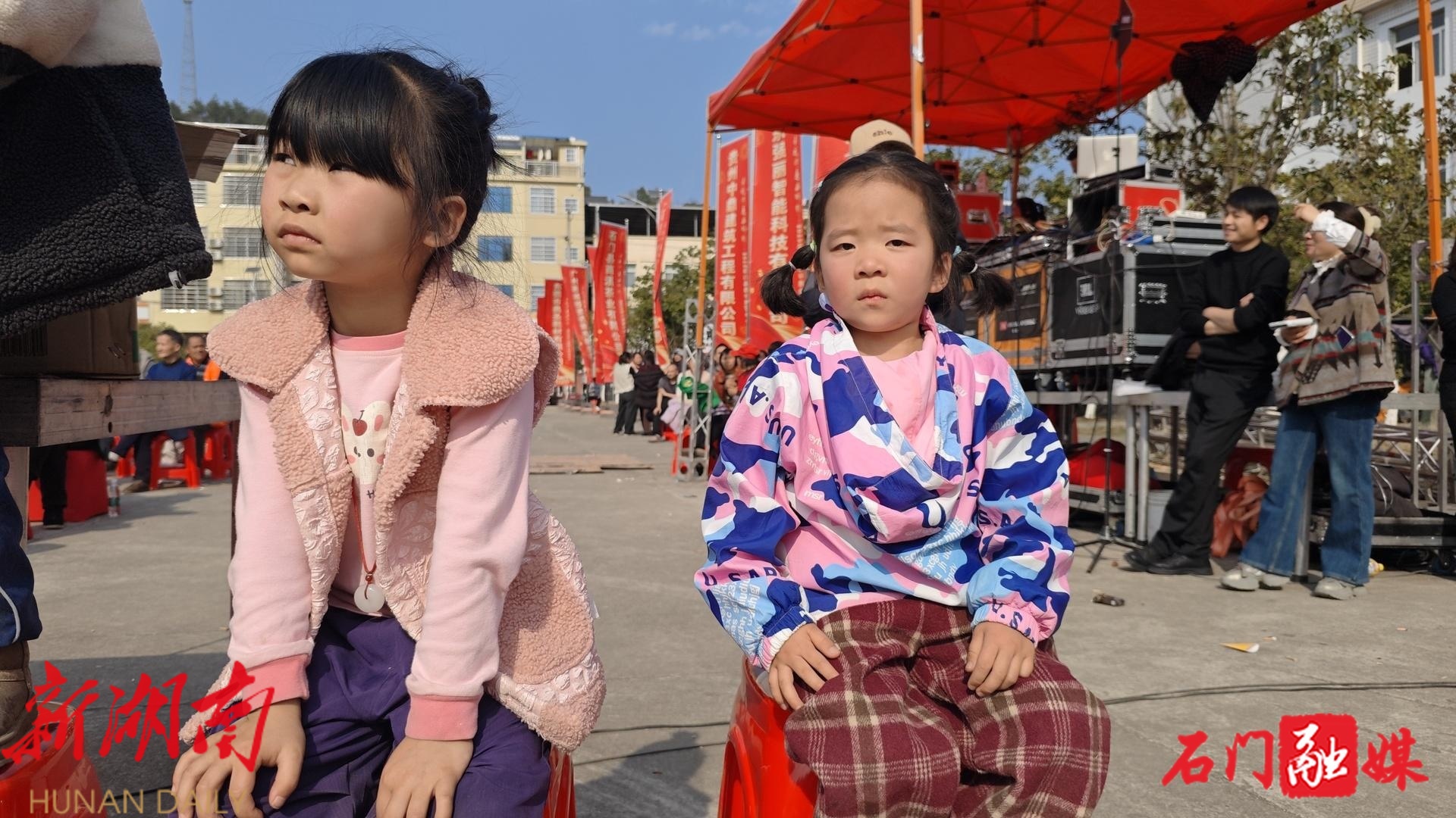 广场正中的舞台已经搭好。红色的背景板上,“春风得意马蹄轻——2025石门县磨市商会年会”的字样格外喜庆。舞台前方,八个白字红底,在冬日的阳光下格外醒目——