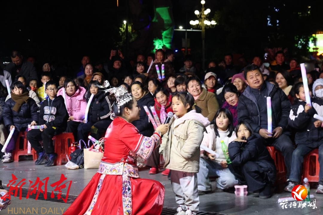 除夕夜,随着一阵激昂的苗鼓敲响,文艺晚会正式拉开帷幕。开场鼓《苗鼓迎宾》气势磅礴,苗族武术刚劲有力,舞龙翻腾起舞……精彩的节目吸引了大量群众驻足。