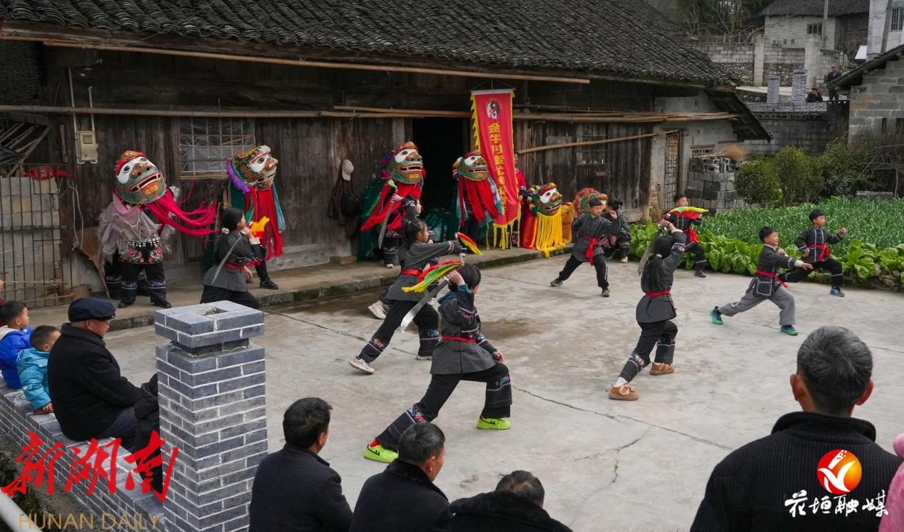 湖南日报·新湖南客户端2月17日讯(通讯员 李德清)春启新章,福满山河。2月17日(农历正月初一 ),花垣县麻栗场镇金牛村以鼓为媒、以狮为信,一场以“非遗贺新春·寻味中国年”为主题的苗狮春节巡游采青送福活动热闹开篇。作为当地民俗的“重头戏”,苗狮队踏着铿锵鼓点穿梭于村寨街巷,以灵动舞姿承载传统仪式,串联起新春喜乐与千年非遗文脉,让群众在浓浓年味中触摸非遗温度,于喜庆祥和中传承文化根脉。