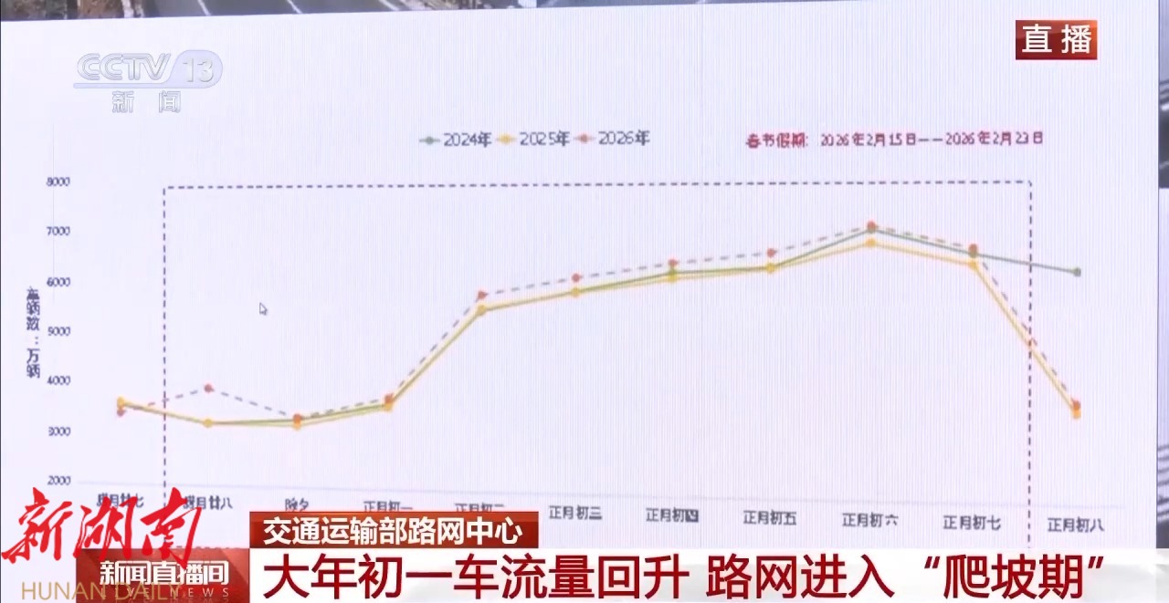 全国路网车流量今天已经进入明显“爬坡期”,与昨天除夕降至谷底的车流量形成鲜明对比。据春节全国路网流量预判图显示,呈现“节前探底、节后攀升”的V形走势,今天开始回升,明天继续攀升,预计将于正月初六迎来春节假期流量最高峰,全国小客车免费通行政策也将在正月初七24时正式结束。