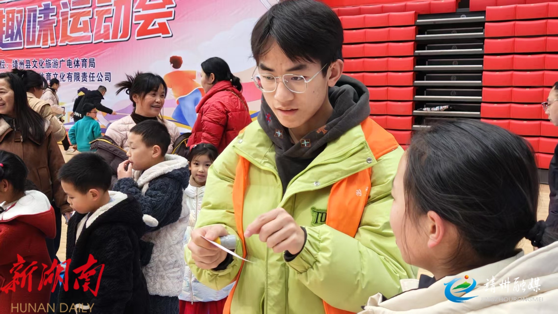 靖州融媒2月19日讯 (记者 刘昊)2月19日,靖州苗族侗族自治县民族体育馆内洋溢着浓郁的新春气息,2026年新春趣味运动会正火热开展。来自全县各地的家庭欢聚于此,以趣味运动解锁新年团圆新方式,现场处处洋溢着欢声笑语。