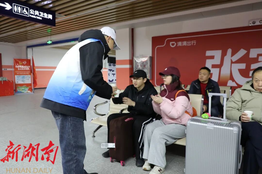 在张家界西站,志愿服务同样细致入微。志愿者们在出站口、候车区等点位主动为游客提供路线指引、行李搬运、景区介绍等服务,帮助来张游客顺利开启新春旅程。来自北京的宫先生刚走出出站口,便收到志愿者递来的一杯热气腾腾的莓茶,温润回甘驱散旅途疲惫。“刚下车就喝到暖心莓茶,张家界的服务很贴心!”宫先生连连称赞。