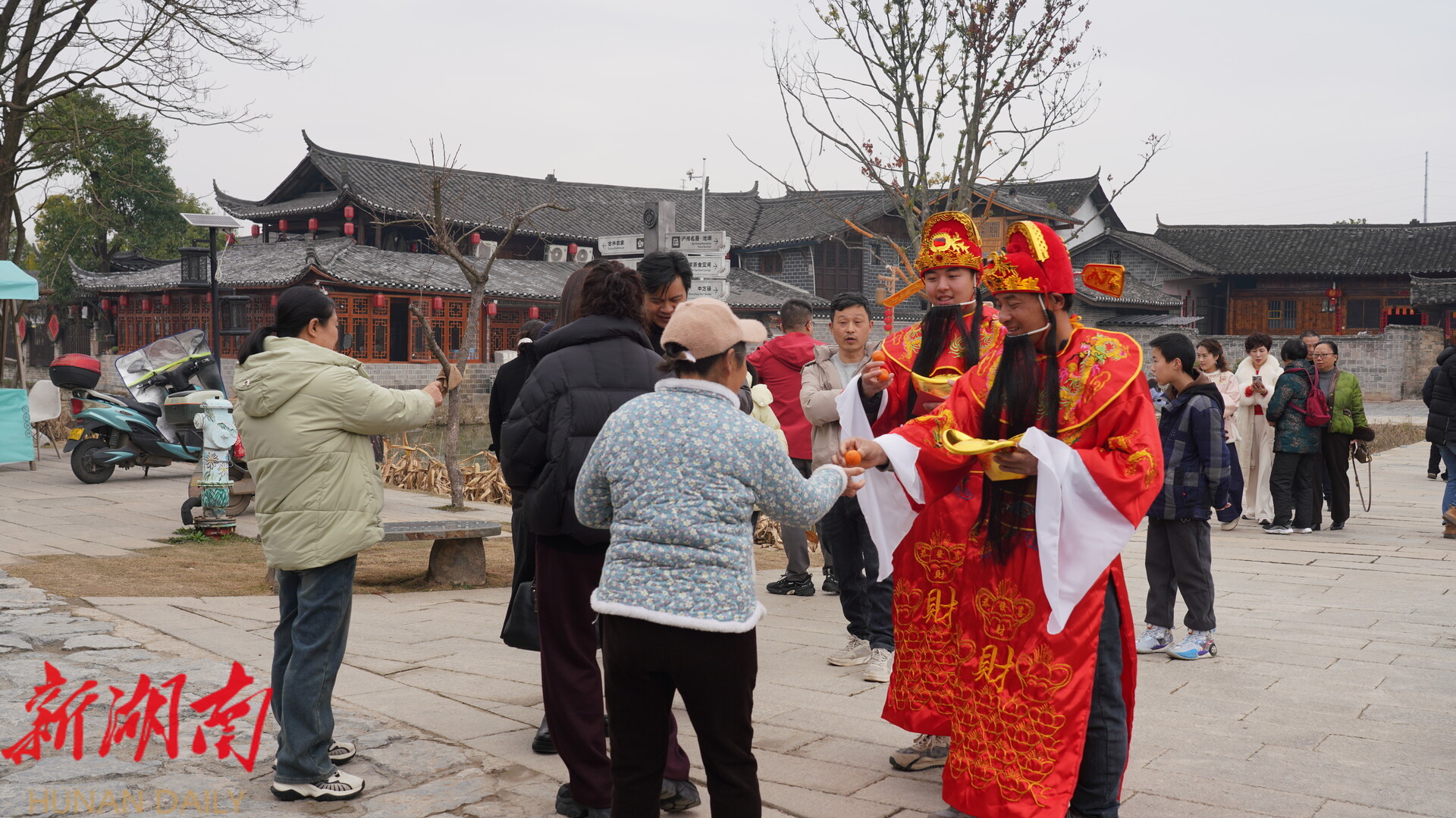 游客们不仅能从“财神爷”手中接过象征吉祥的糖果,还能参与趣味十足的成语接龙游戏,答对者即可获得财神送上的新春红包,古村内热闹喜庆,笑声不断。