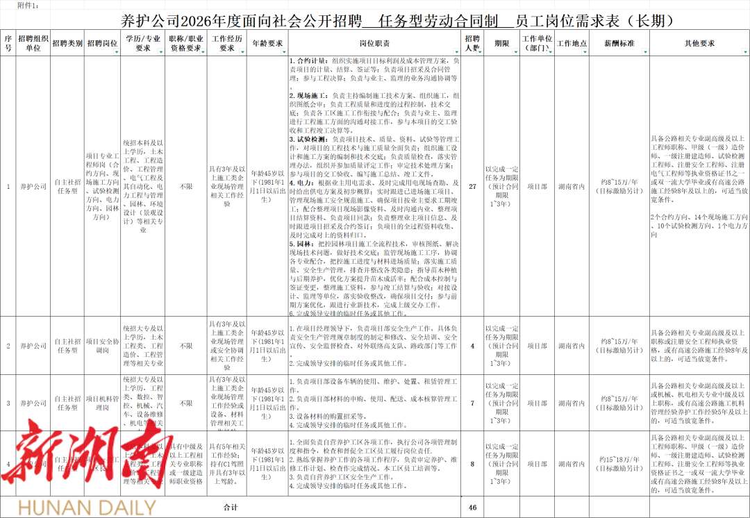 湖南高速养护工程有限公司 2026年面向社会公开招聘任务型劳动合同制员工的公告