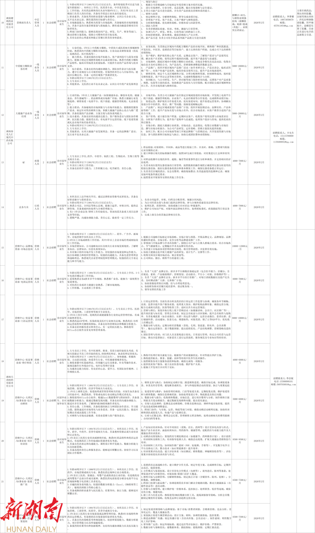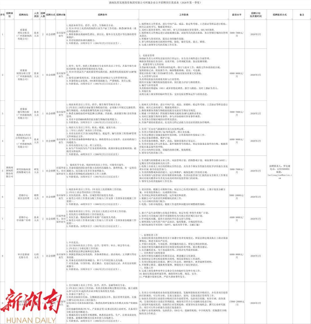 湖南医药发展投资集团有限公司所属企业公开招聘公告 (2026年第一季度)