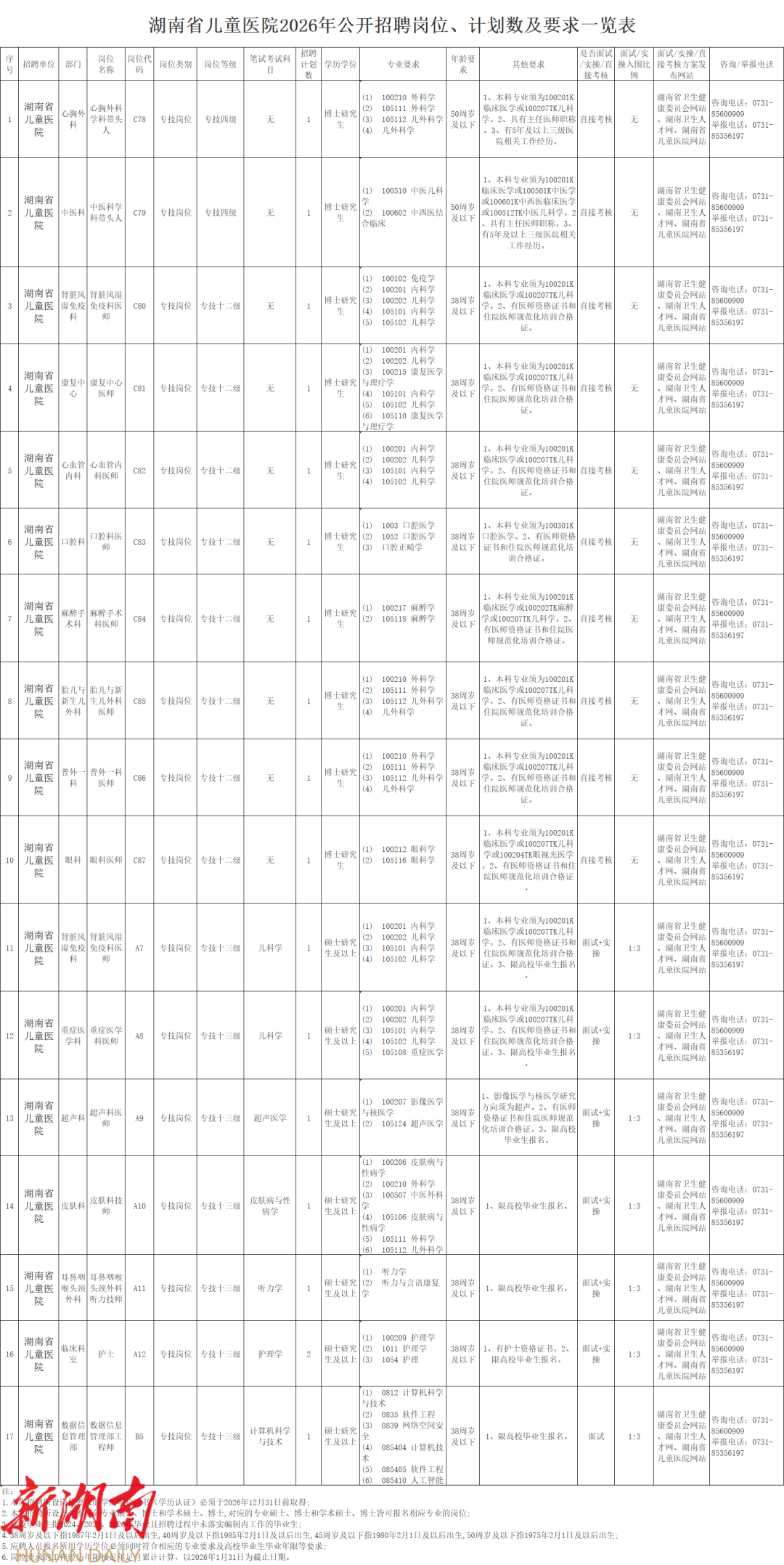 湖南省儿童医院2026年公开招聘公告