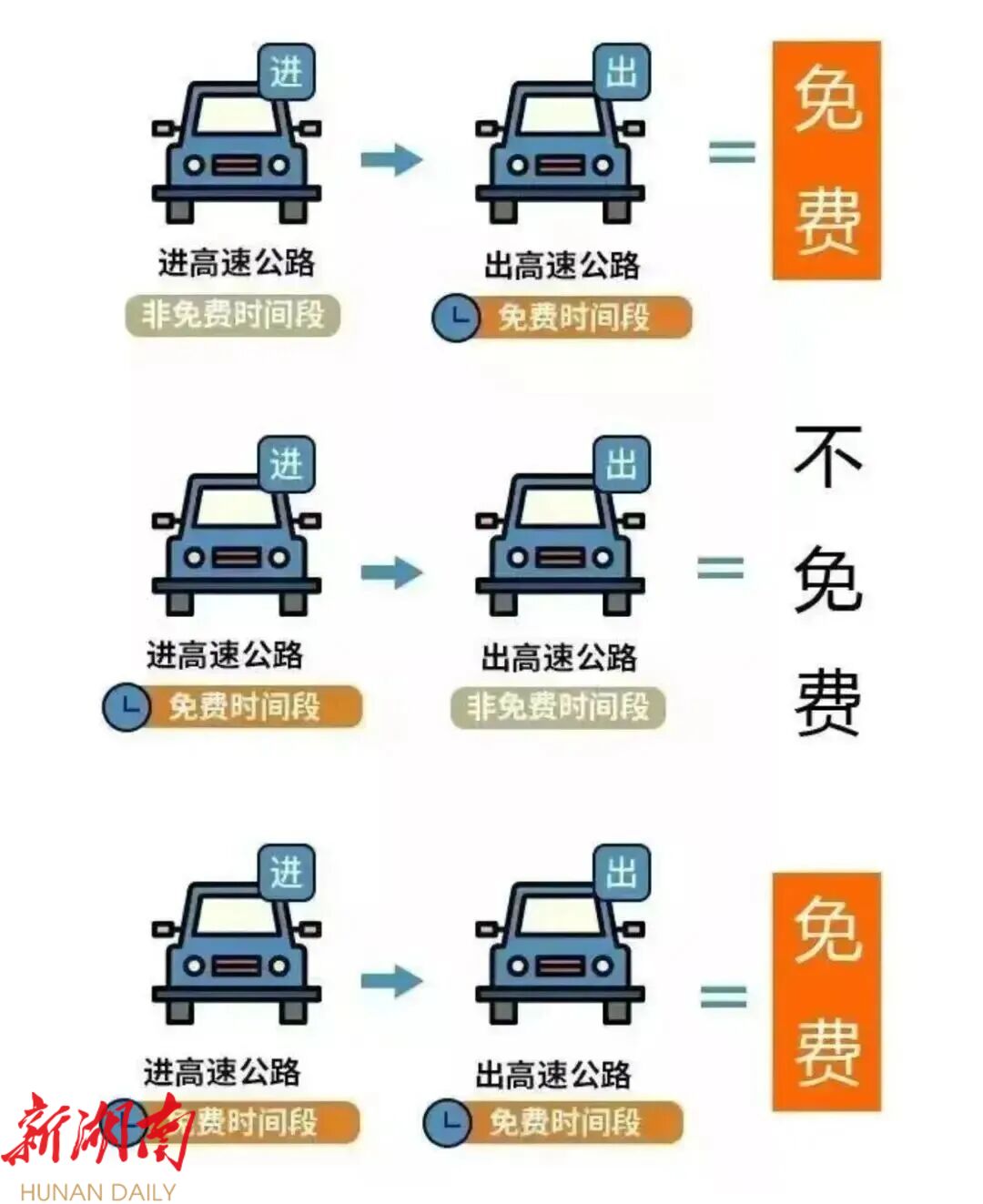在免费时段即将结束前仍在高速公路行驶的,可选择就近收费站出高速后,再重新上高速 ,避免因赶时间、超速行驶引发安全事故,同时可最大限度地享受免费政策。