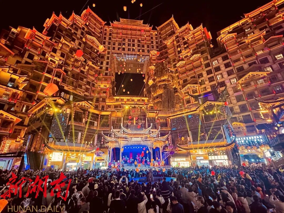 永定的新春夜色,不止有市井烟火,更有惊艳的民俗风情。夜幕降临,七十二奇楼华灯璀璨,层层叠叠的土家吊脚楼建筑群在光影勾勒下氛围感拉满,成为永定区夜游打卡的“顶流地标”。春节期间,景区精心编排了非遗民俗盛宴,龙灯巡游、土家打溜子、三棒鼓、摆手舞篝火晚会等特色活动轮番上演,身着土家族民族服饰的NPC穿梭街巷与游客趣味互动,沉浸式的游玩体验让往来游客流连忘返。