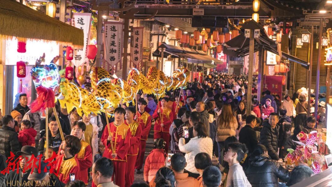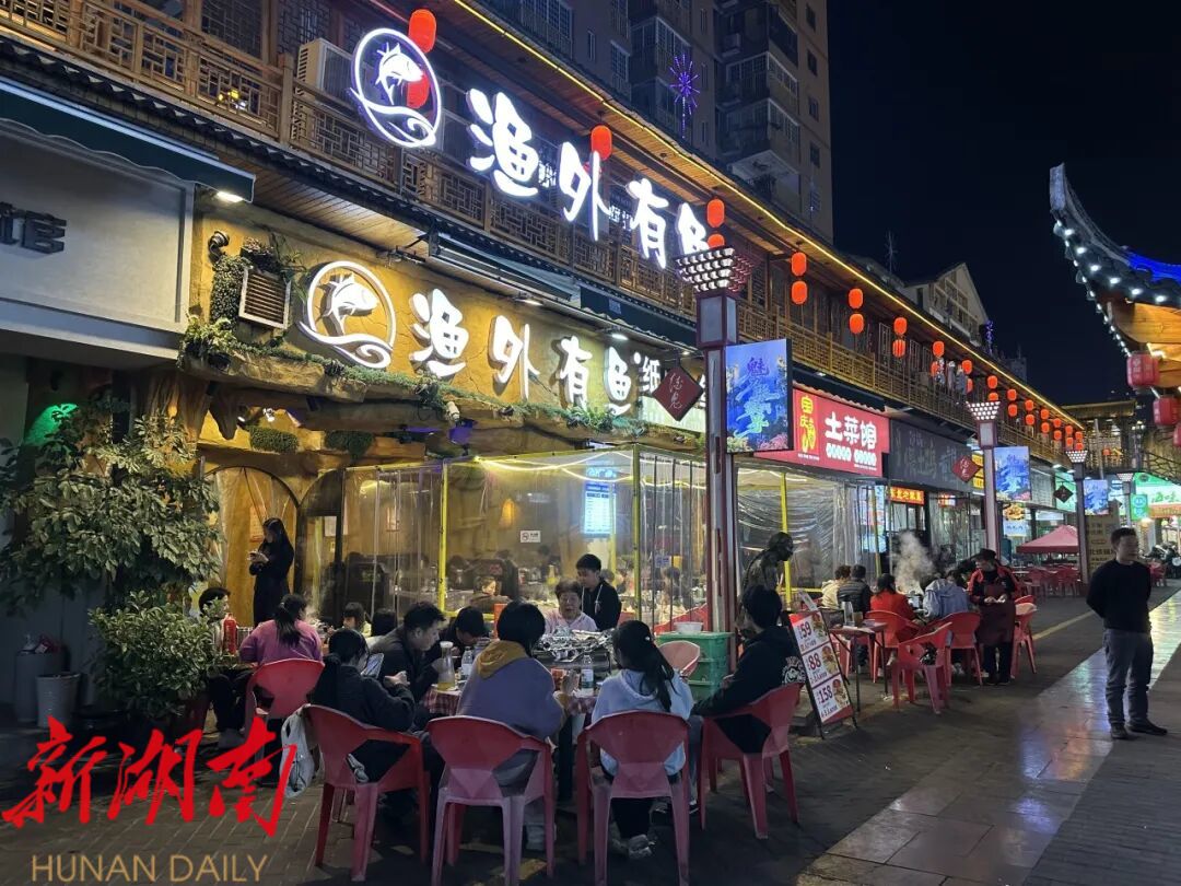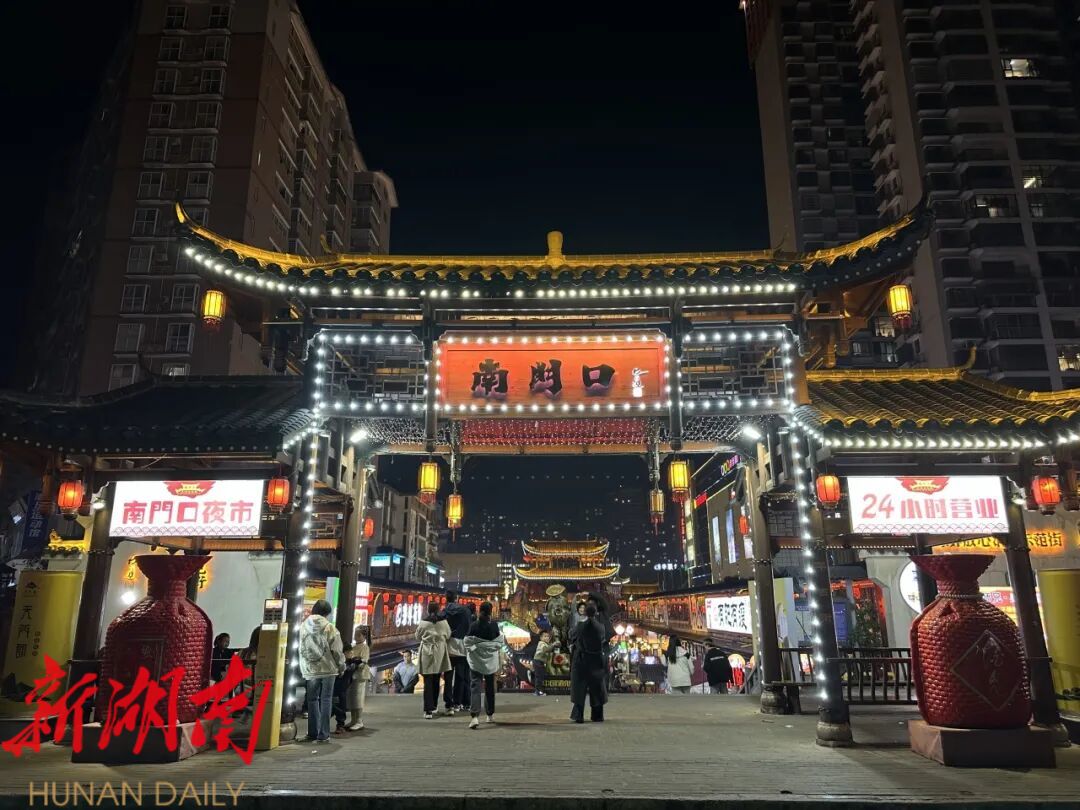 湖南日报·新湖南客户端2月23日讯(通讯员 谢丽琼 廖芯仪)2月22日晚,华灯初上,夜幕降临,永定区南门口美食街、七十二奇楼等地灯光璀璨,喜气洋洋,年味儿十足,来自全国各地的游客穿梭其间,赏夜景、品美食、闹新春,烟火气与民俗味交织相融,新春消费活力持续迸发。