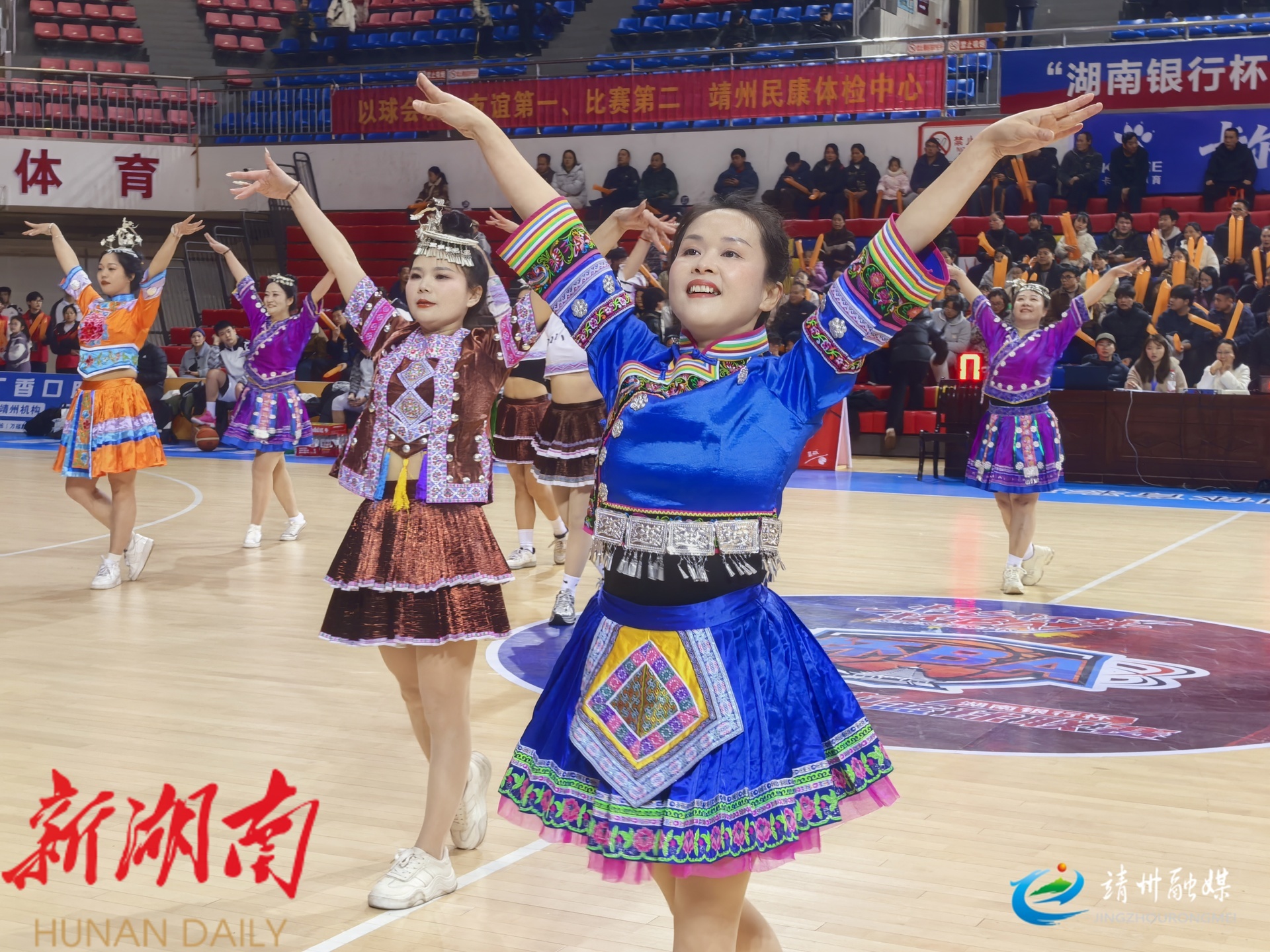 在靖州民族体育馆,赛前舞蹈《福地漫游》灵动登场,时尚民族风走秀惊艳亮相,浓郁的民族风情点燃赛场氛围,民族文化与体育精神完美交融。比赛开始后,通道队率先发力,连续命中三记三分球取得领先。靖州队迅速调整状态,稳扎稳打将比分追平,双方随即展开激烈拉锯,比分交替上升、悬念迭起。