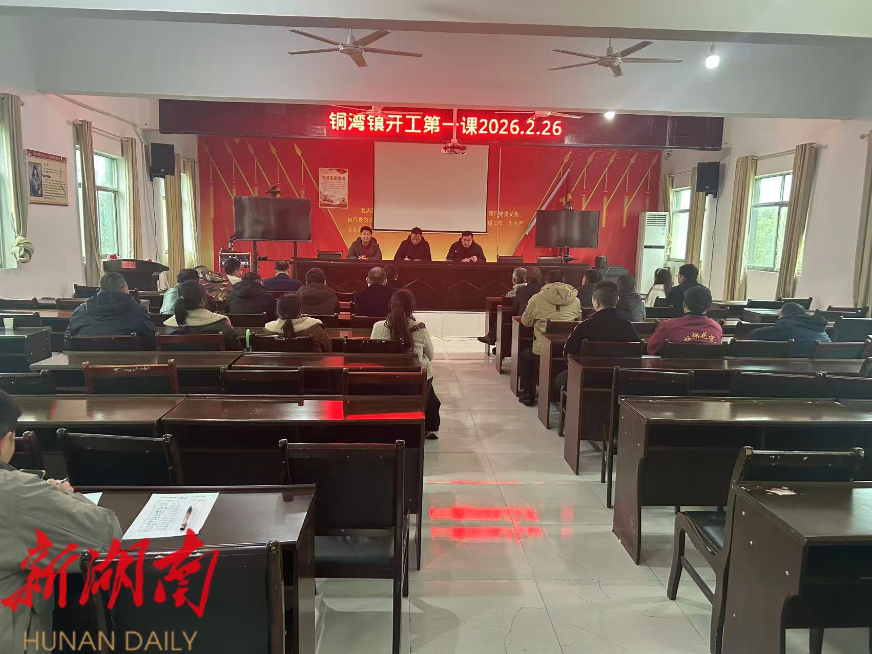 中方融媒2月27日讯 (通讯员:米湘)2月26日,铜湾镇组织召开2026年生产经营单位复工复产“开工第一课”暨安全生产警示教育大会。镇党委书记、镇政法委员、镇应急办负责人及全镇烟花爆竹店、加油站、学校、酒店宾馆、车站等重点场所经营者参会。