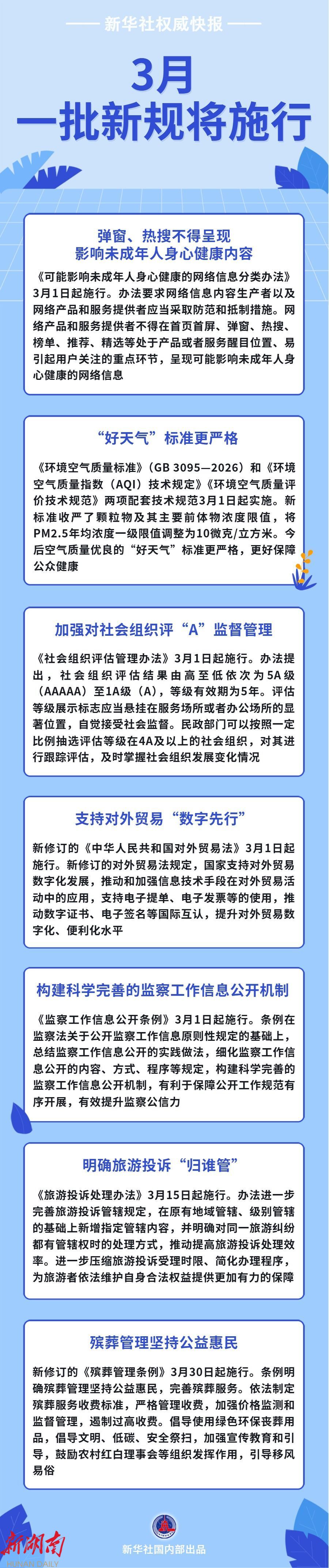 首页首屏、弹窗热搜等不得呈现影响未成年人身心健康的网络信息;“好天气”标准更严格,更好保障公众健康;加强对社会组织评“A”监督管理……3月,一批新规将施行,一起来看!