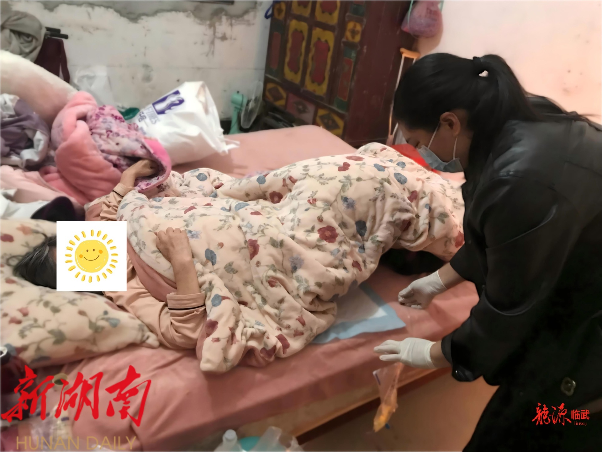 同一天,武水镇邝家村的邝奶奶家也迎来了“健康使者”。61岁的邝奶奶因脊髓损伤长期卧床,除夕当天尿管意外脱出,皮肤还出现了压疮的苗头。接到求助后,唐姣再次出发。她一边重新置管,一边手把手教家属如何正确翻身、使用减压贴、保持皮肤干爽。“预防胜于治疗,咱们不仅要过好年,更要守好老人的皮肤。”唐姣的一番话,让家属心里踏实了不少。