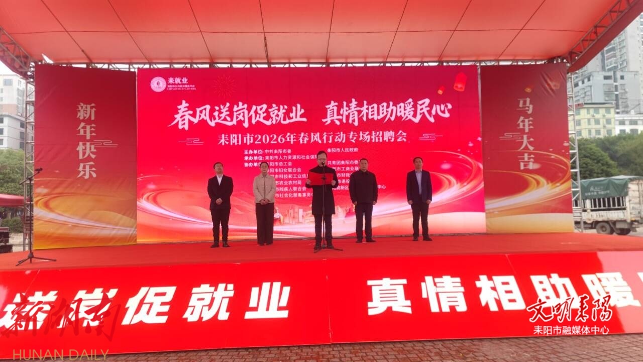 耒阳融媒2月26日讯(记者 李靖宇 刘喜 蒋境) 2月26日,耒阳市2026年“春风行动”暨就业援助月专场招聘会启幕。市委副书记、政法委书记王星皓致辞并宣布开幕,市领导周斐、谢东平、丁念明出席活动。