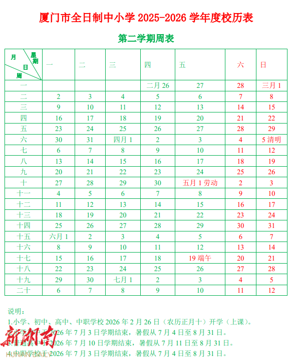 以福建厦门的校历为例,2026年春季学期2月26日正式上课,7月4日左右放暑假,总时长约20周,但减去清明、五一、端午假期,实际教学天数不到90天。