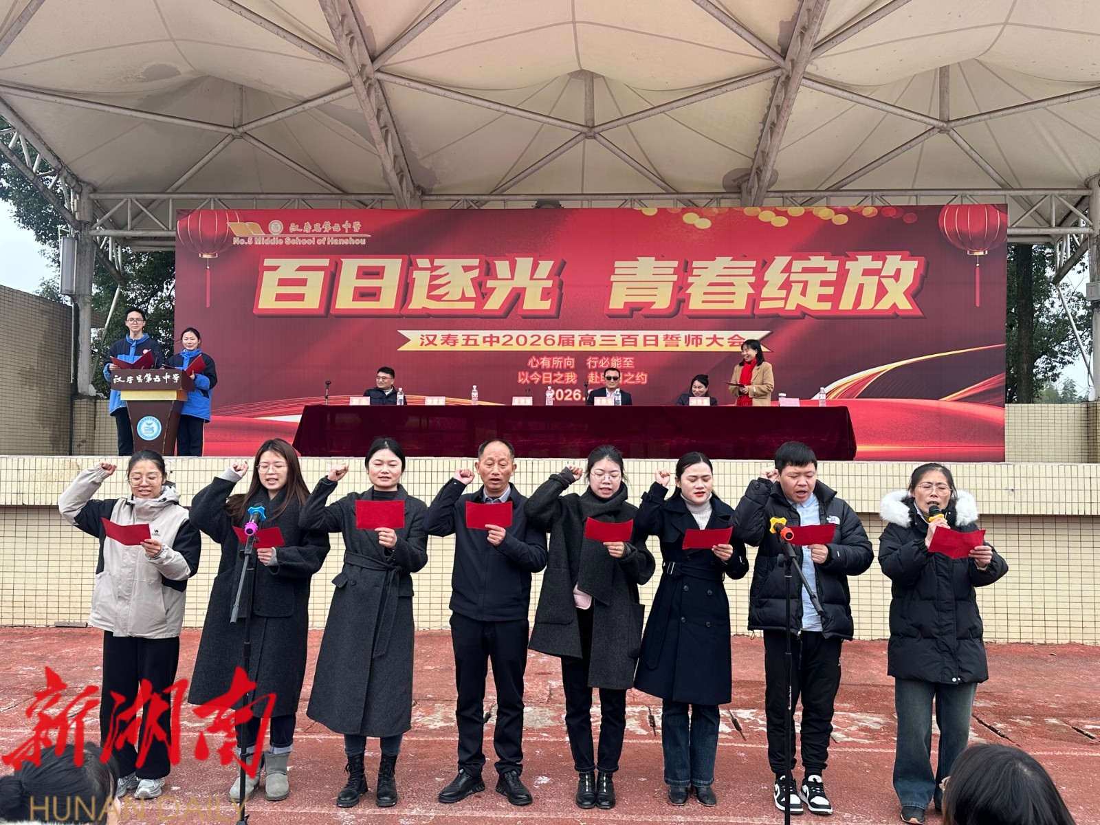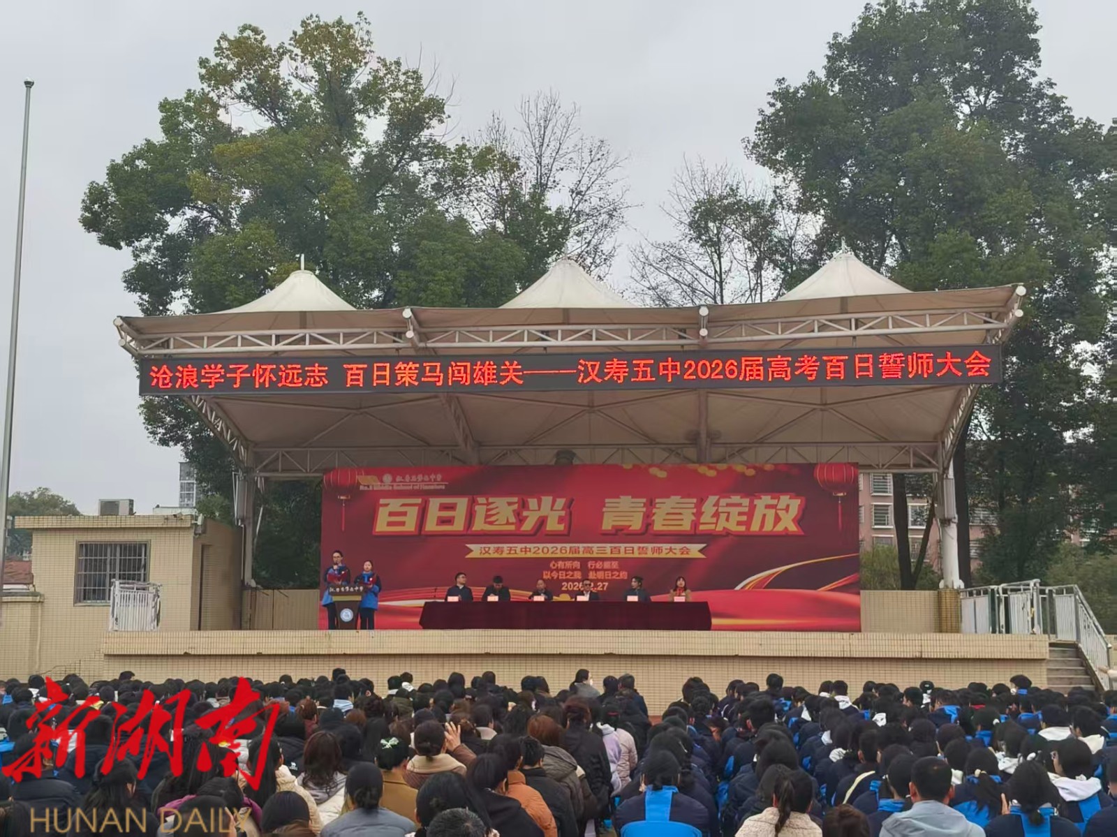 汉寿融媒2月28日讯(通讯员:王源)春寒未散,希望萌芽。2 月 27 日,汉寿五中举行 2026 届高考百日誓师大会,全体高三师生、家长齐聚一堂,吹响决战高考 冲刺号角。