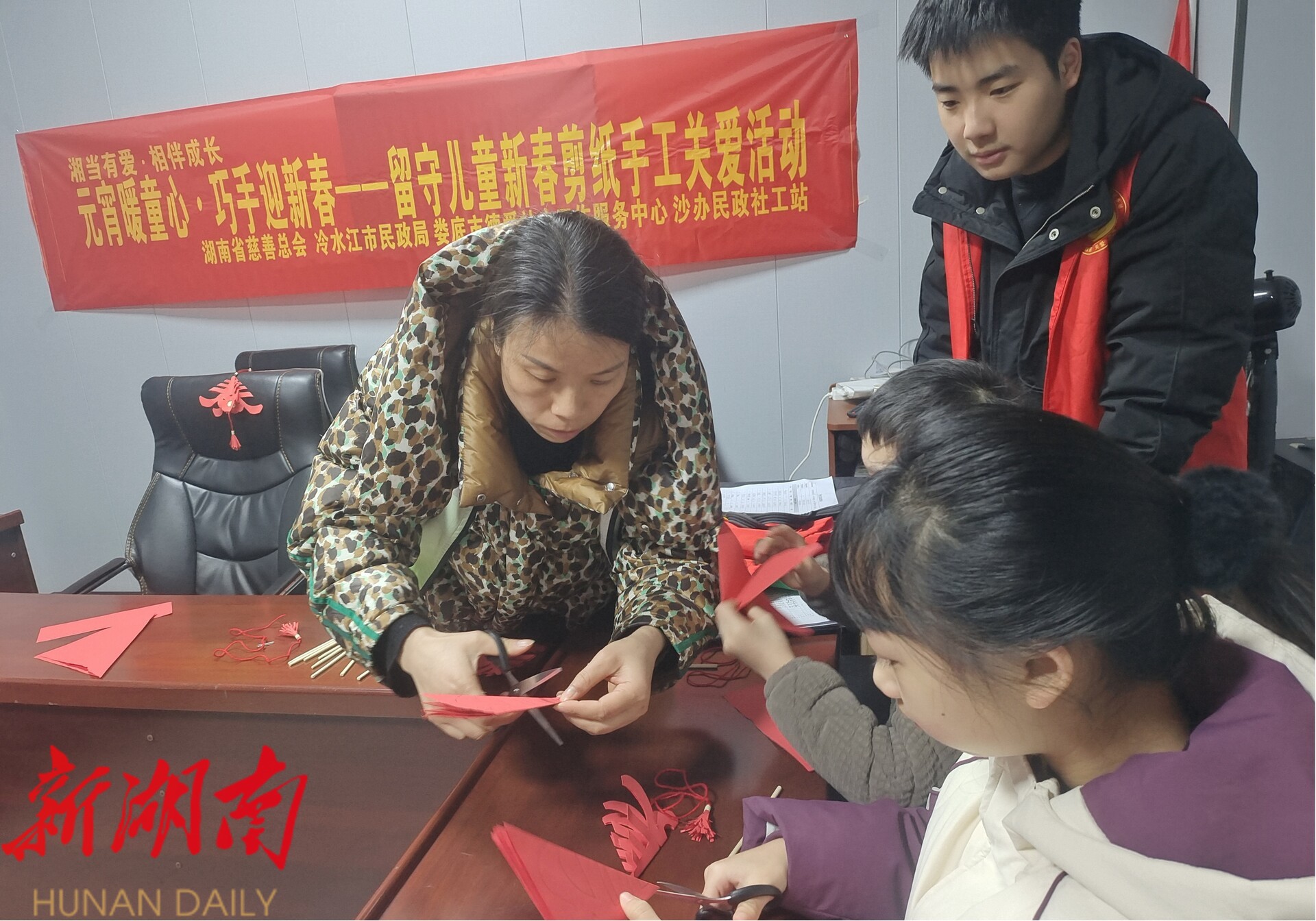 新冷水江3月4日讯(通讯员 李文静 谢女英 李亦殊)3月3日,农历正月十五,沙塘湾街道民政社工站在崇北社区留守儿童之家开展“元宵暖童心·巧手迎新春”新春剪纸手工关爱活动。15名留守儿童在监护人与社工、志愿者的陪伴下,剪“春”字、学民俗、领爱心物资,在欢声笑语中感受节日的温暖与社会的关怀。