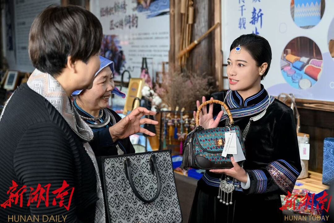 韦朝晖(右)与湖南侗锦、广西壮锦织娘交流。通讯员吴涛摄