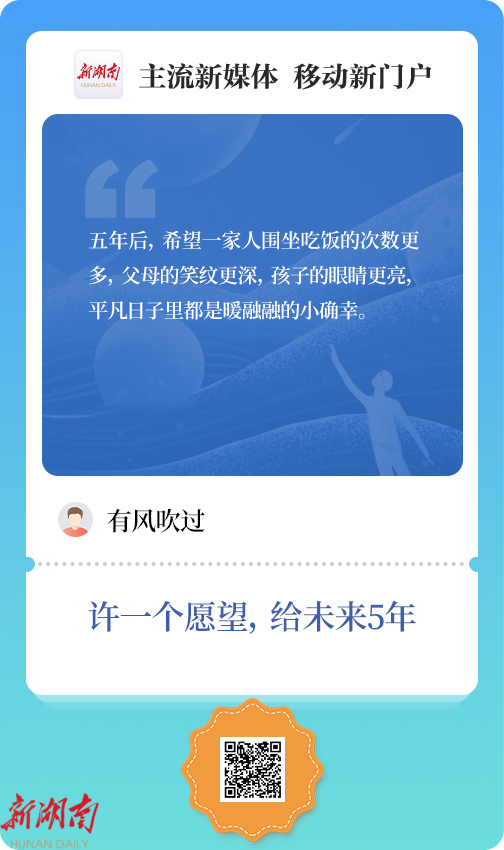 新湖南客户端推出“许一个愿望,给未来 5 年”线上征集活动以来,收到了上万条来自全国各地网友的心愿投稿,这些愿望既勾勒出人们对生活最真挚的期盼,也描摹着大家对国家发展蓝图的美好向往。