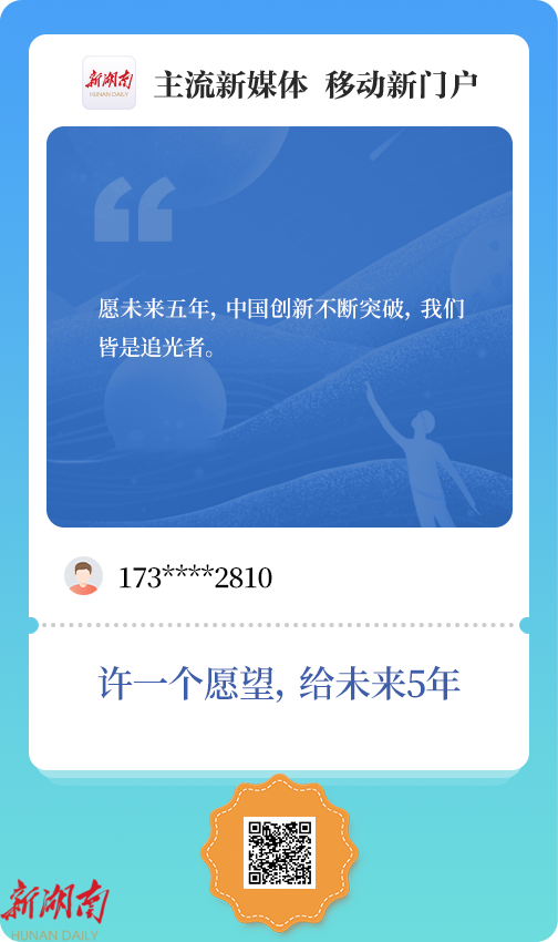 关于未来 , 你还有什么心愿?新湖南客户端 “许一个愿望,给未来五年”线上征集活动仍在继续。点击“许一个愿望,给未来五年” ,写下你的心愿,让我们一起为下一个五年播下梦想的种子。