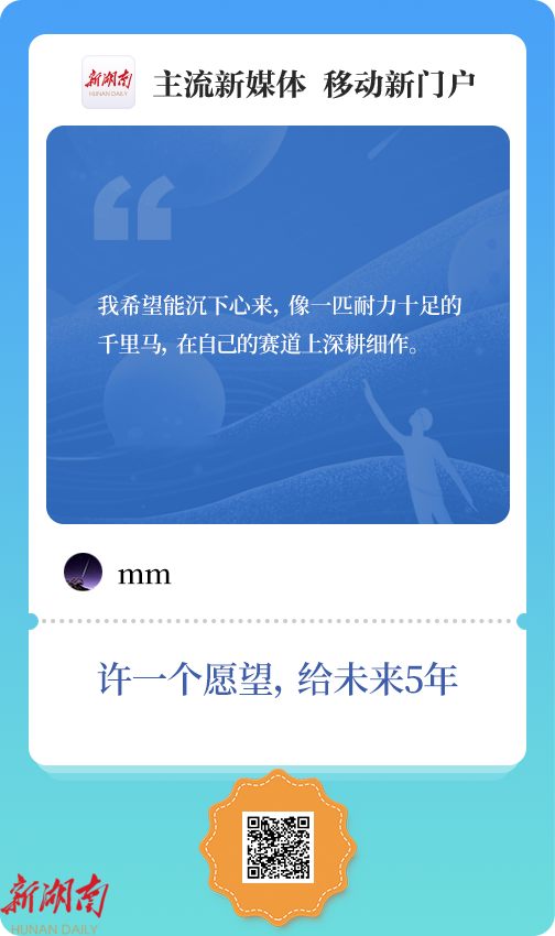 “宁静致远”: 期待乡村振兴的种子在五年间开花结果 —— 故乡的田野不仅有丰收的稻浪,还有青年返乡创业的笑声;非遗手艺在数字时代重生,山货通过电商走进千家万户。愿湖湘大地既守得住根脉,也扬得起风帆,让每一个远行与归来的人,都拥有心安之处。