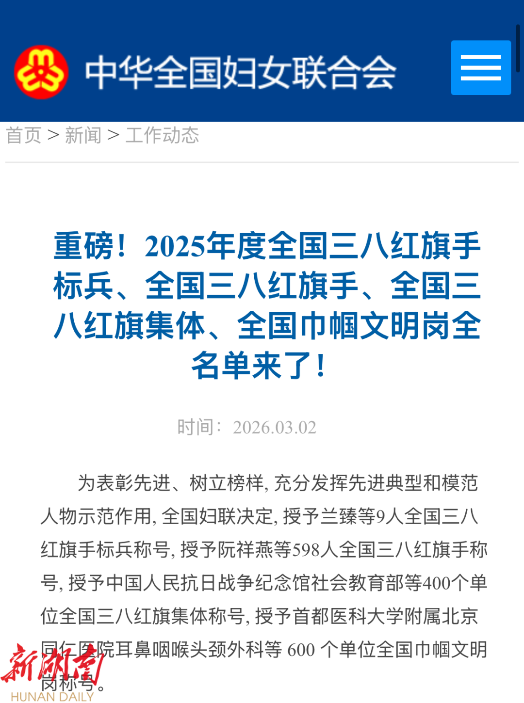 3月2日,中华全国妇女联合会发布了2025年度全国三八红旗手标兵、全国三八红旗手、全国三八红旗集体、全国巾帼文明岗全名单,其中,张家界市永定区西溪坪街道渡口社区居委会凭借突出表现获评“全国三八红旗集体”。
