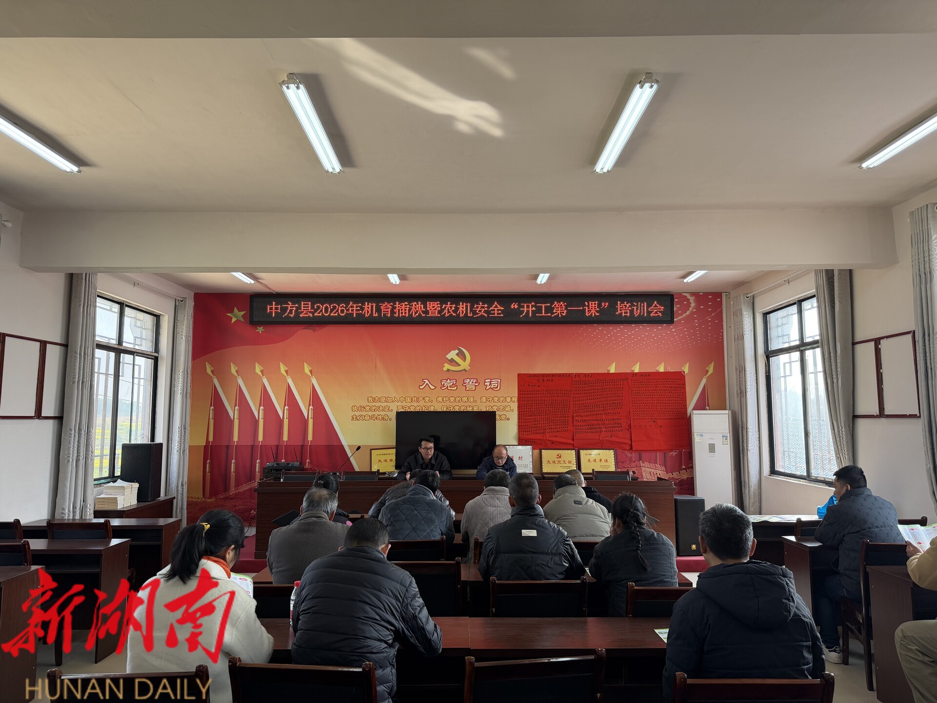 中方融媒3月6日讯 (记者:梁洁)人勤春来早,备耕正当时 。3月5日,中方县农机事务中心到中方县铜湾镇松坡村举办2026年机育插秧技术暨农机安全“开工第一课”培训会,农机合作社负责人、种粮大户参加。