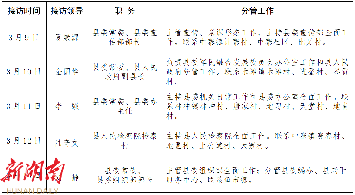 为进一步畅通信访渠道,方便群众依法及时就地反映、解决问题,现将2026年3月第二周新晃侗族自治县县级领导干部公开接访安排公告如下。