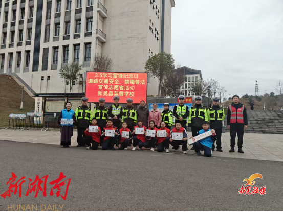 新晃融媒3月9日讯(通讯员:吴锦霞)为传承弘扬雷锋精神,筑牢校园安全防线,近日,新晃禁毒委联合新晃公安局交通管理大队、新晃禁毒协会、新晃微爱志愿者协会、新晃同心公益社会工作服务中心,在新晃芙蓉学校校门口开展道路交通安全、禁毒普法志愿宣传活动,将安全知识与法治理念送到师生身边,助力青少年健康成长。